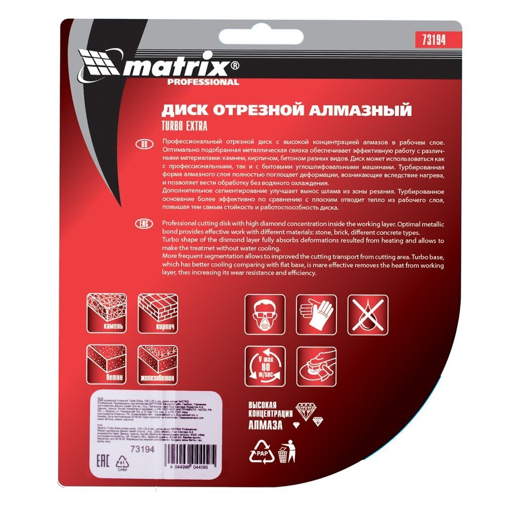 Вы можете приобрести «Диск алмазный отрезной Turbo Extra, 125 х 22,2 мм, сухая резка, Matrix, 73194» и другие товары в нашем интернет-магазине в Санкт-Петербургe по низким ценам и с бесплатным самовывозом.