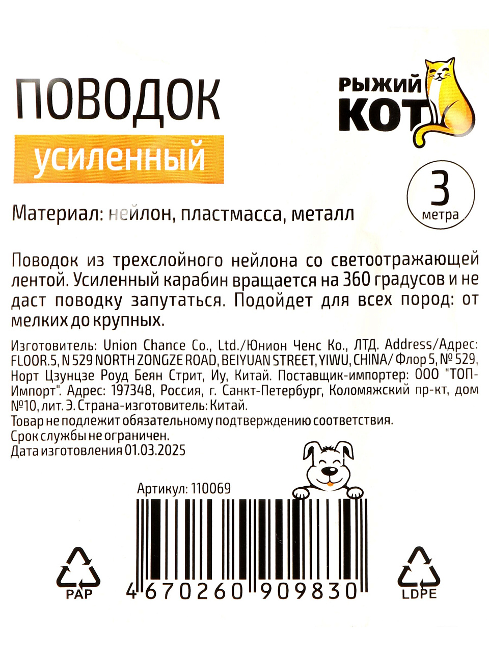 Тип: усиленный нейлоновый поводок, длина — 300 см, бренд — Рыжий кот, страна продавца — Китай, количество в упаковке — 1 шт.