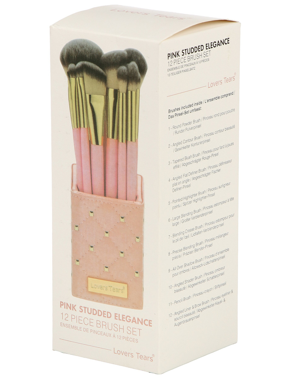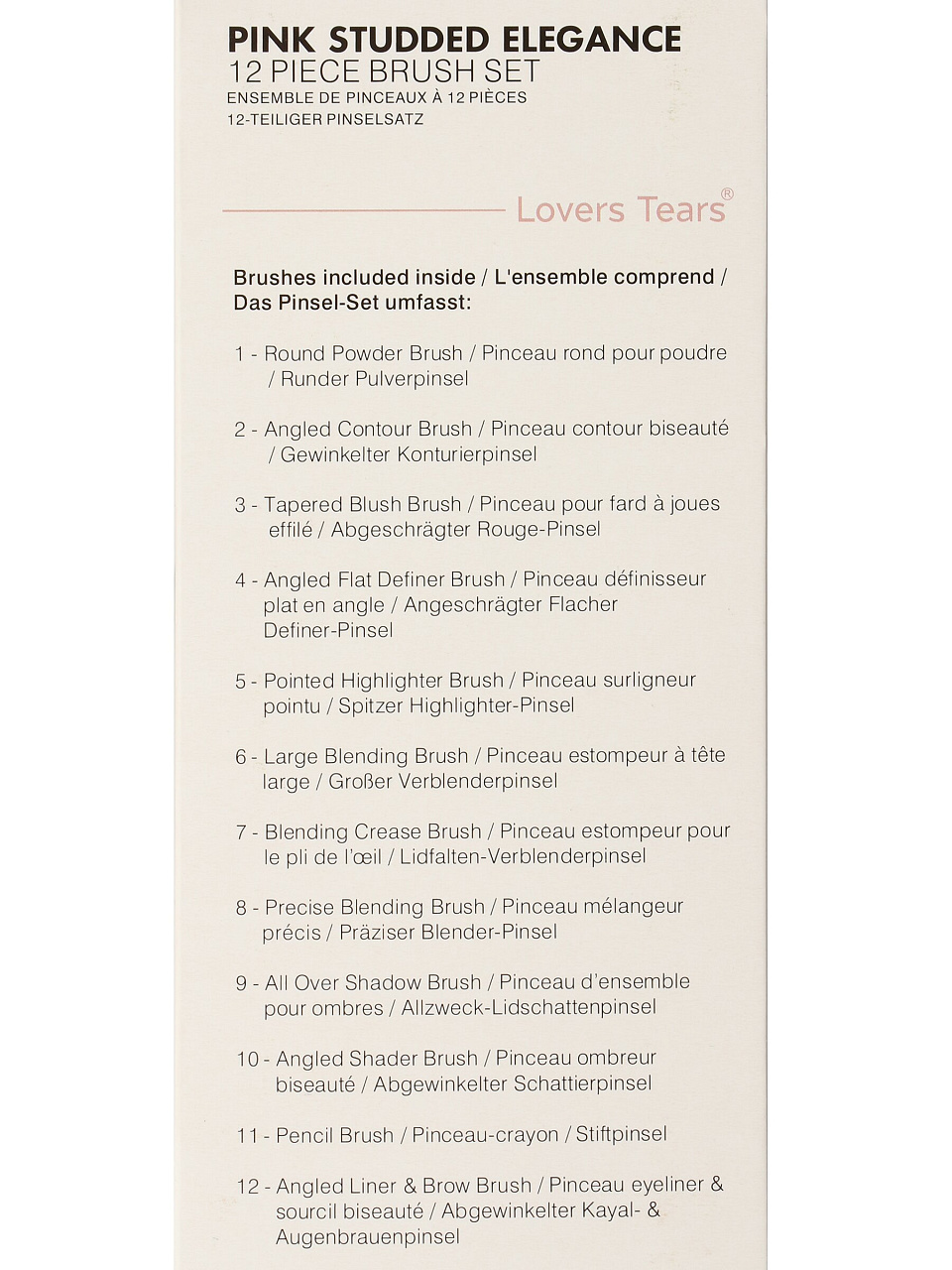 В комплекте 12 кистей: для тональной основы, румян, пудры, теней, подводки, бровей и губ. Все инструменты выполнены из синтетического ворса и подходят для жидких и сухих текстур.