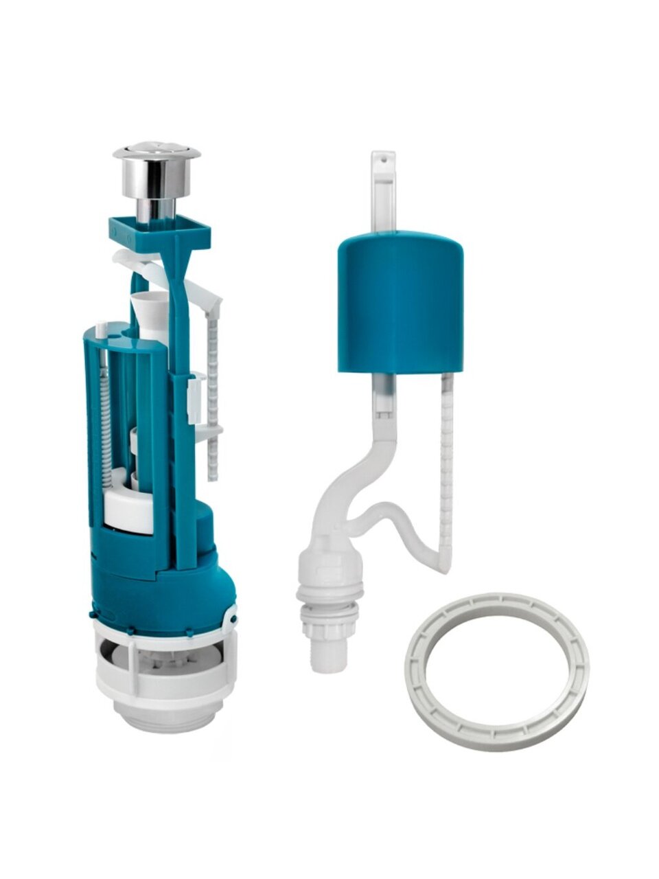 Комплект арматуры для бачка к унитазу. Сливной клапан СБ2 кнопочный с двумя режимами слива. Клапан СБ2 - для слива полного объема бачка необходимо нажать на большую кнопку смыва, для смыва 50% содержимого бачка необходимо нажать малую кнопку смыва.
