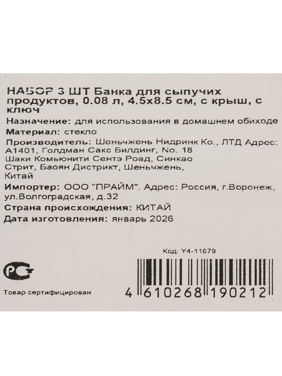Вы можете приобрести «Банка для сып продуктов, стекло, 3 шт, 0.08 л, 4.5х8.5 см, с крыш, с ключ, Y4-11679» и другие товары в нашем интернет-магазине в Смоленске по низким ценам и с бесплатным самовывозом.