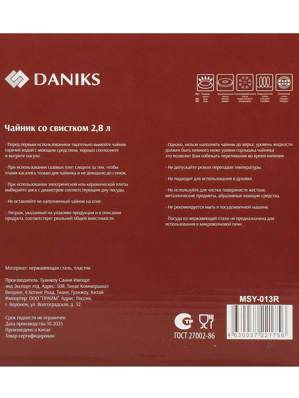 Закажите чайник Daniks 2.8 л прямо сейчас — получите гарантию 12 месяцев и бесплатную доставку при покупке от 3000 руб. Надёжность, стиль и комфорт — выгодное решение для вашей кухни.