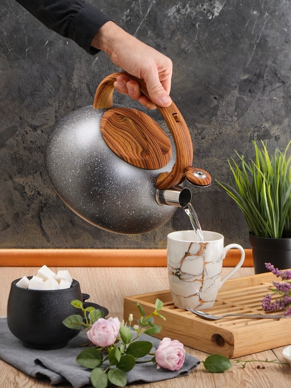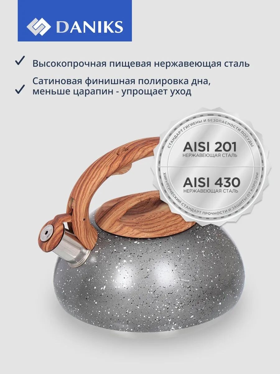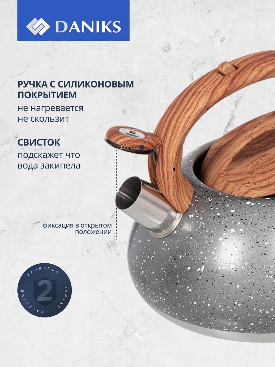 Чайник Daniks 3 л из нержавеющей стали — идеальный выбор для дома и дачи: безопасная силиконовая ручка, стиль «серый мрамор», свисток, гарантия 12 мес.