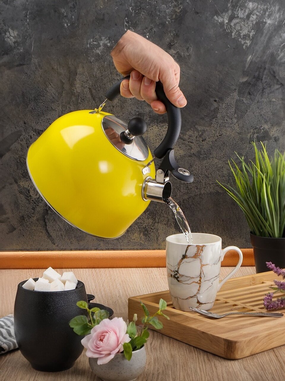 Чайник оснащен клапаном-свистком, который позволяет контролировать процесс кипения. Кнопка управления клапаном находится на ручке, поэтому вы не сможете обжечься о раскаленный носик при наливании воды. Эргономичная ручка из бакелита не нагревается, что позволяет комфортно и безопасно использовать чайник сразу после кипячения. Подвижность ручки обеспечивает удобное использование при наливании воды. В процессе нагревания нержавеющая сталь не выделяет вредные вещества, не окисляется, она гипоаллергенна и долговечна. Цветной корпус чайника в сочетании с нержавеющей сталью, черной ручкой и носиком выглядит ярко и стильно.