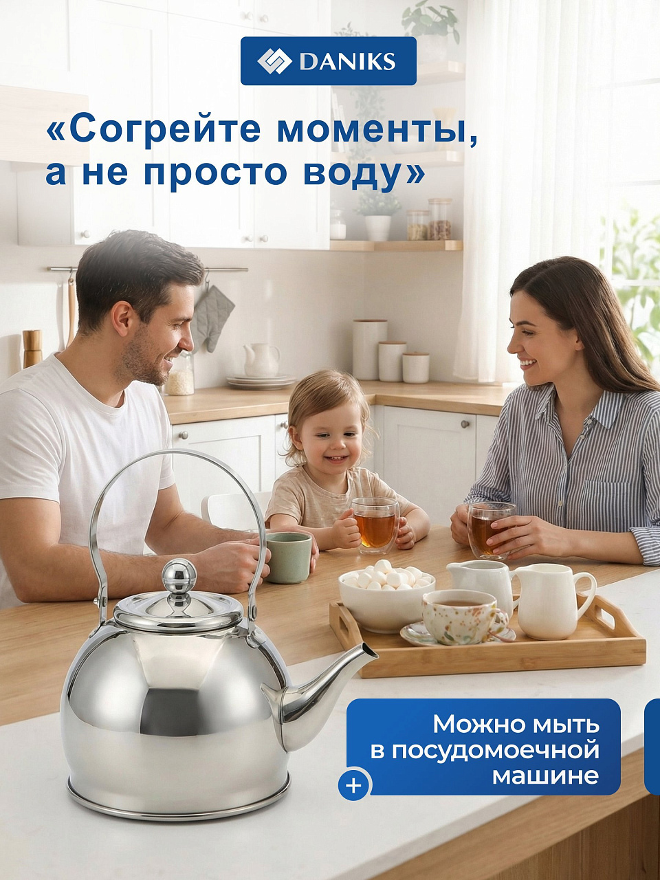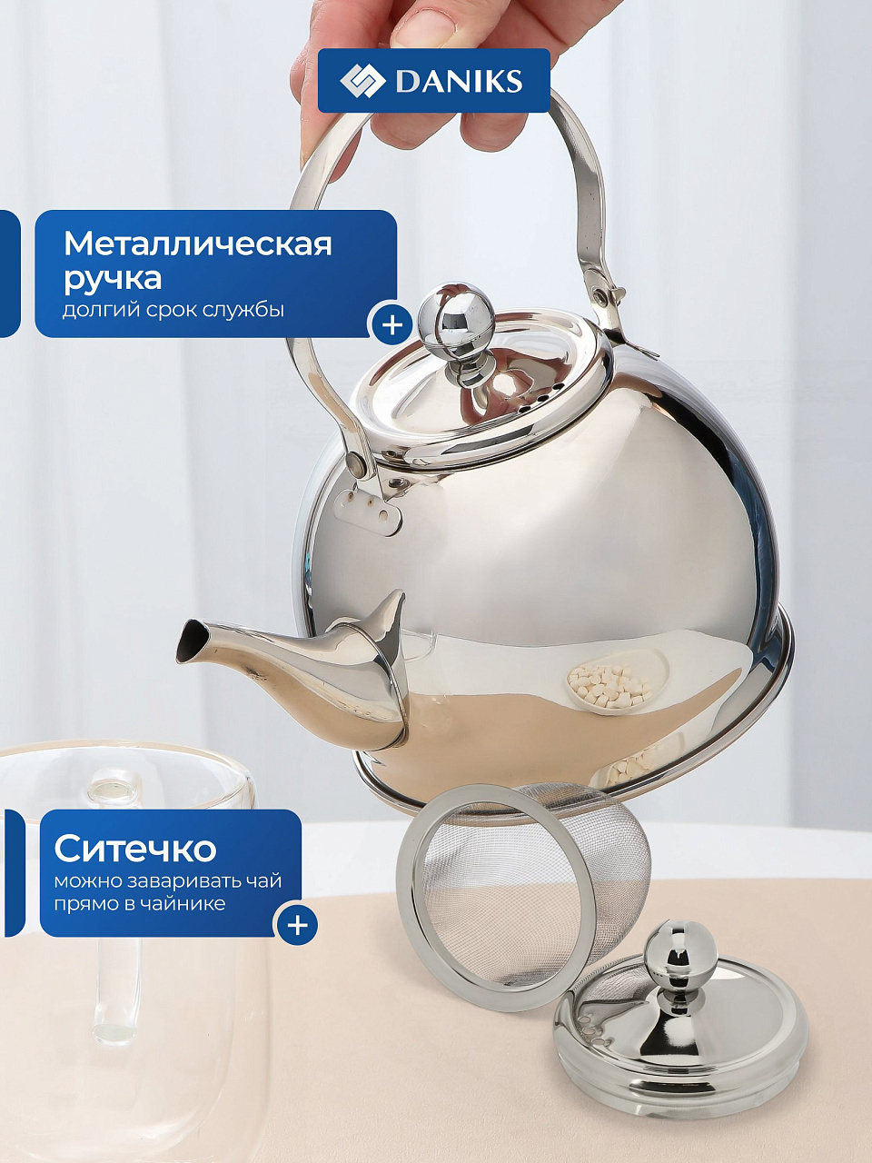 Чайник из нержавеющей стали Daniks 0.8 л — компактное решение для дома и дачи: зеркальная полировка, ситечко в комплекте, подходит для индукции и посудомоечной машины.