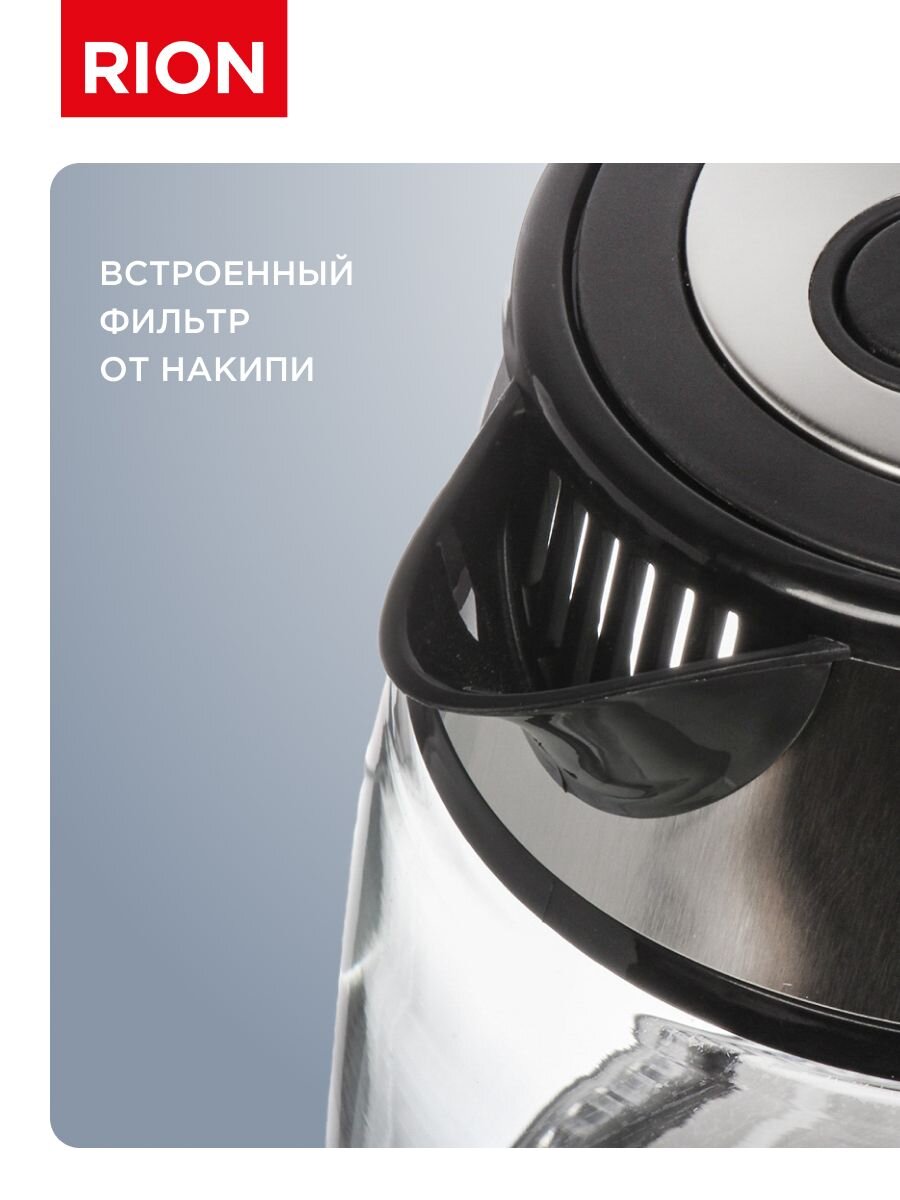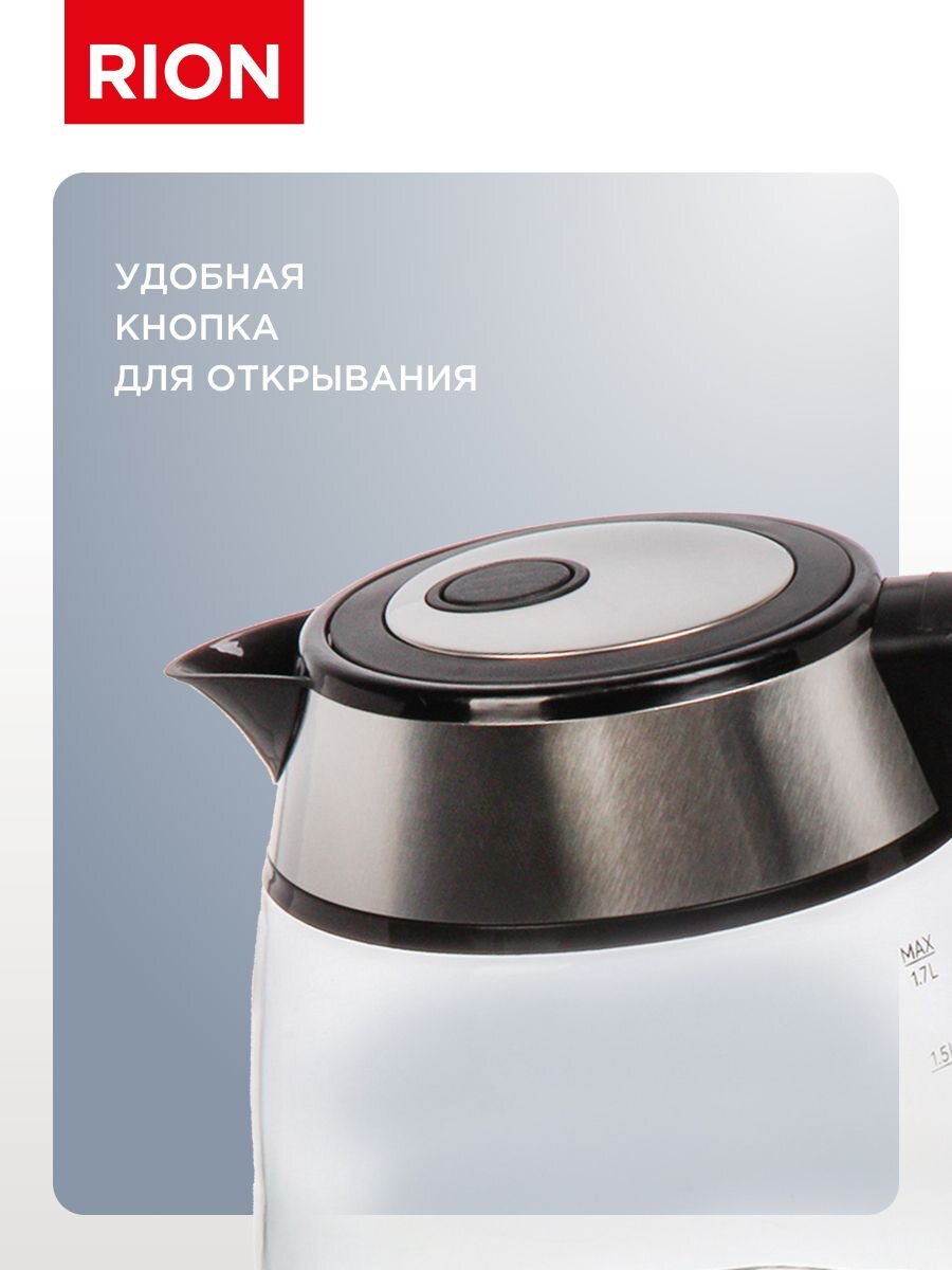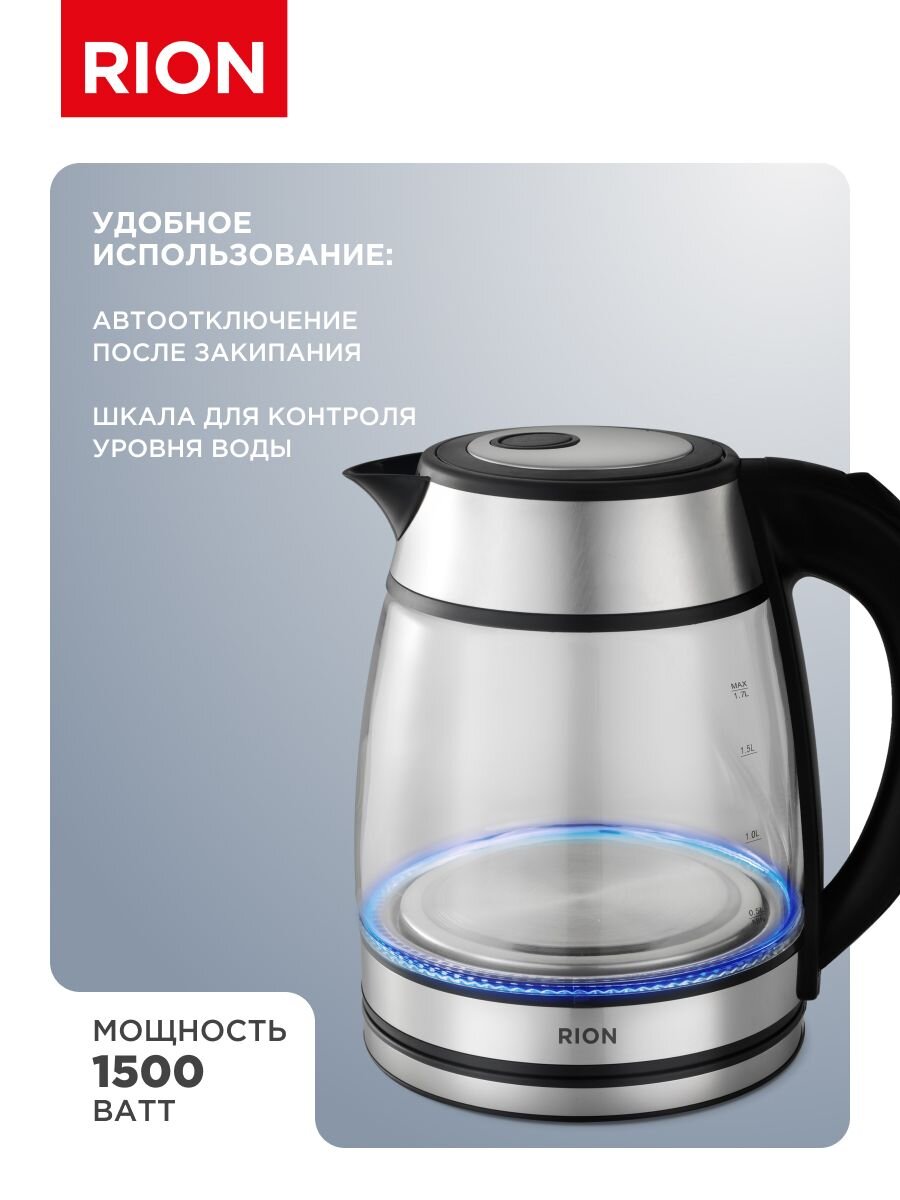 Чайник Rion объемом 1.7 литра идеально подходит для больших семей или офисов, где требуется частое кипячение воды. Черный цвет корпуса придает ему стильный и современный вид, который отлично вписывается в любую кухонную обстановку. Благодаря стеклянной колбе и подсветке, процесс нагрева воды становится не только функциональным, но и эстетически приятным.