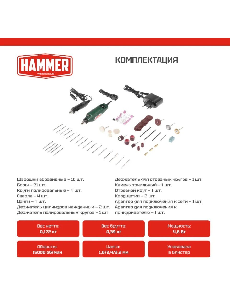 Дрель Hammer, MD050A, цанговый патрон, 3.2 мм, 4.8 Вт, 1 скорость, 80 аксессуаров, мини