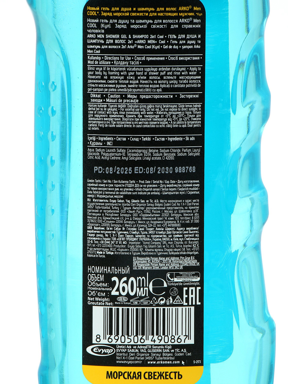 Гель для душа и шампунь Arko Men Cool 2в1 — свежесть и уход для мужчин: экономия времени, двойной эффект, 260 мл для активной жизни.