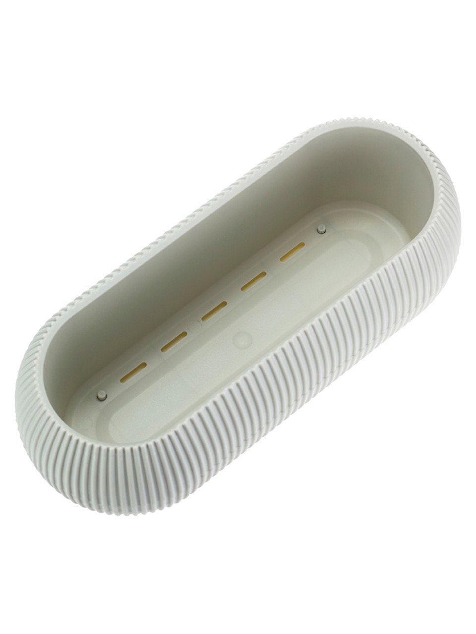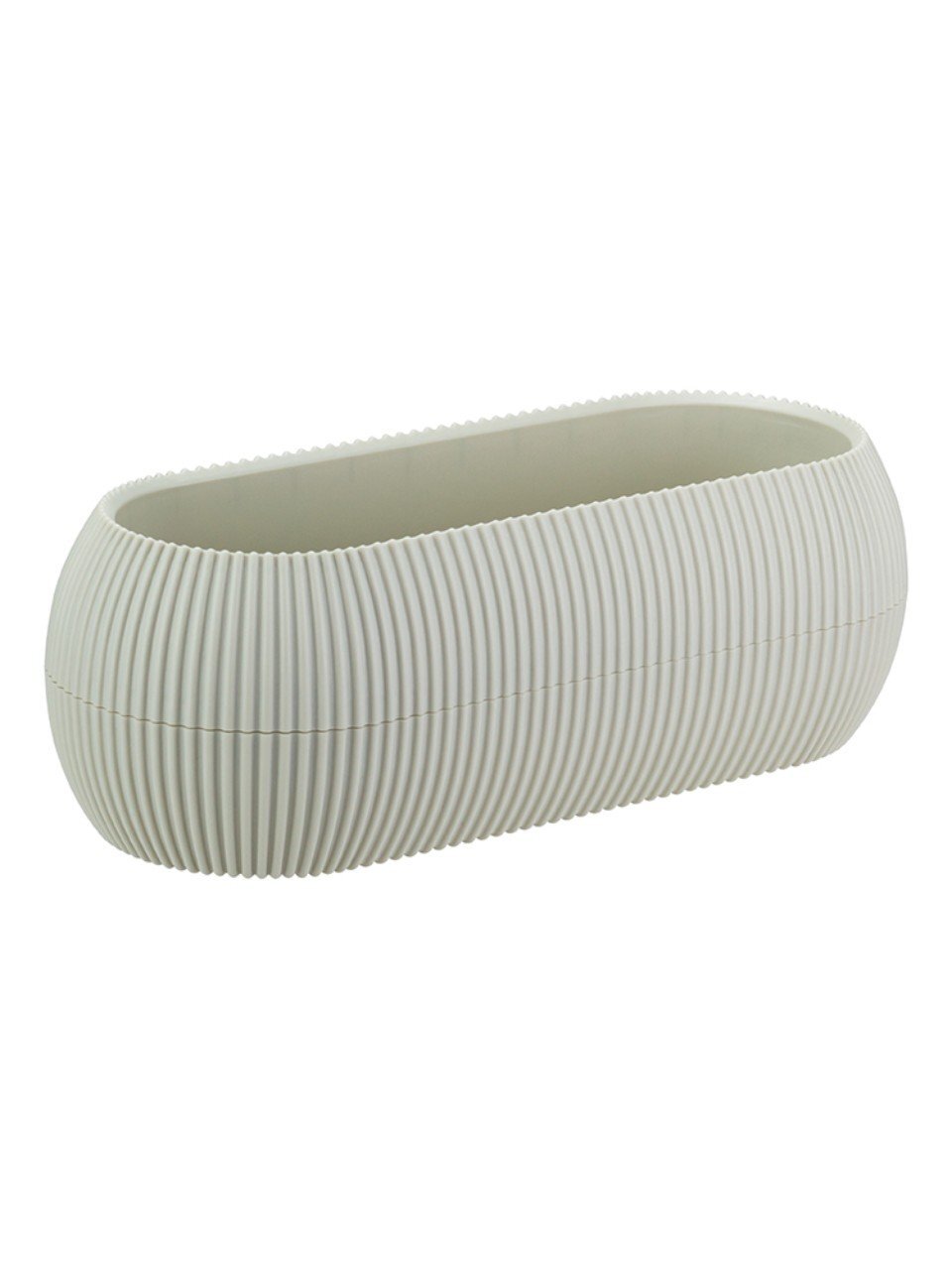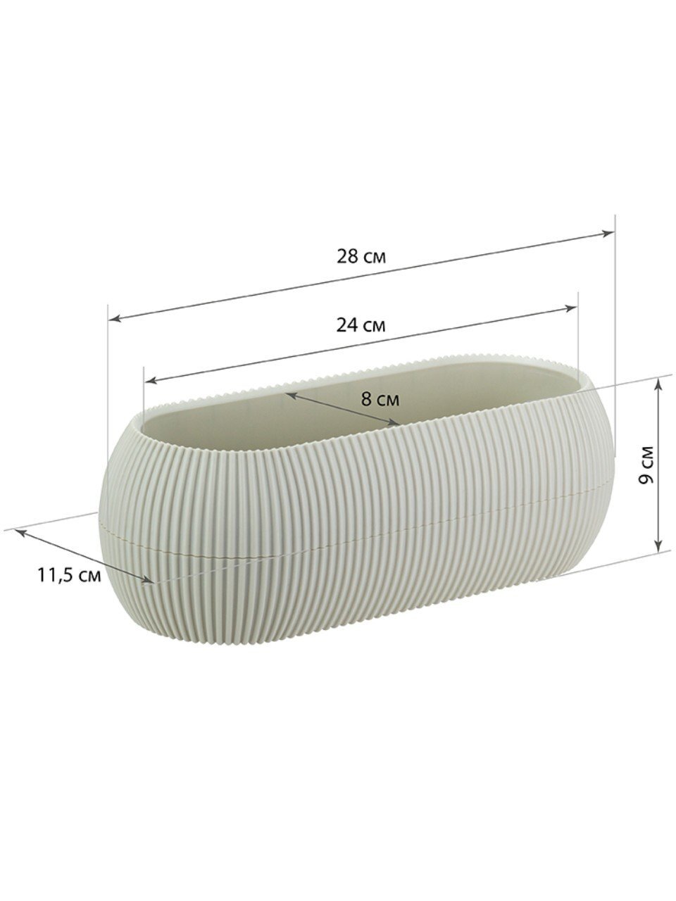 Длина 28 см, ширина 11.5 см, высота 9 см, объём 1.3 литра. Овальная форма и белый цвет делают его универсальным для большинства комнатных растений.