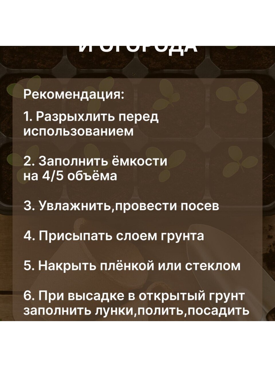 Рекомендации: перед использованием грунт необходимо разрыхлить. Для выращивания рассады овощных культур нужно высыпать содержимое пакета в стаканчики, ящики и другие емкости на 4/5 объема, полить и провести посев, сверху присыпать грунтом (высота слоя в зависимости от культуры, некоторым мелкосемянным присыпка не требуется) и накрыть пленкой или стеклом для создания микроклимата. При высадке рассады в открытый грунт рекомендовано заполнить питательным грунтом посадочные бороздки и лунки, полить при необходимости и произвести посадку.