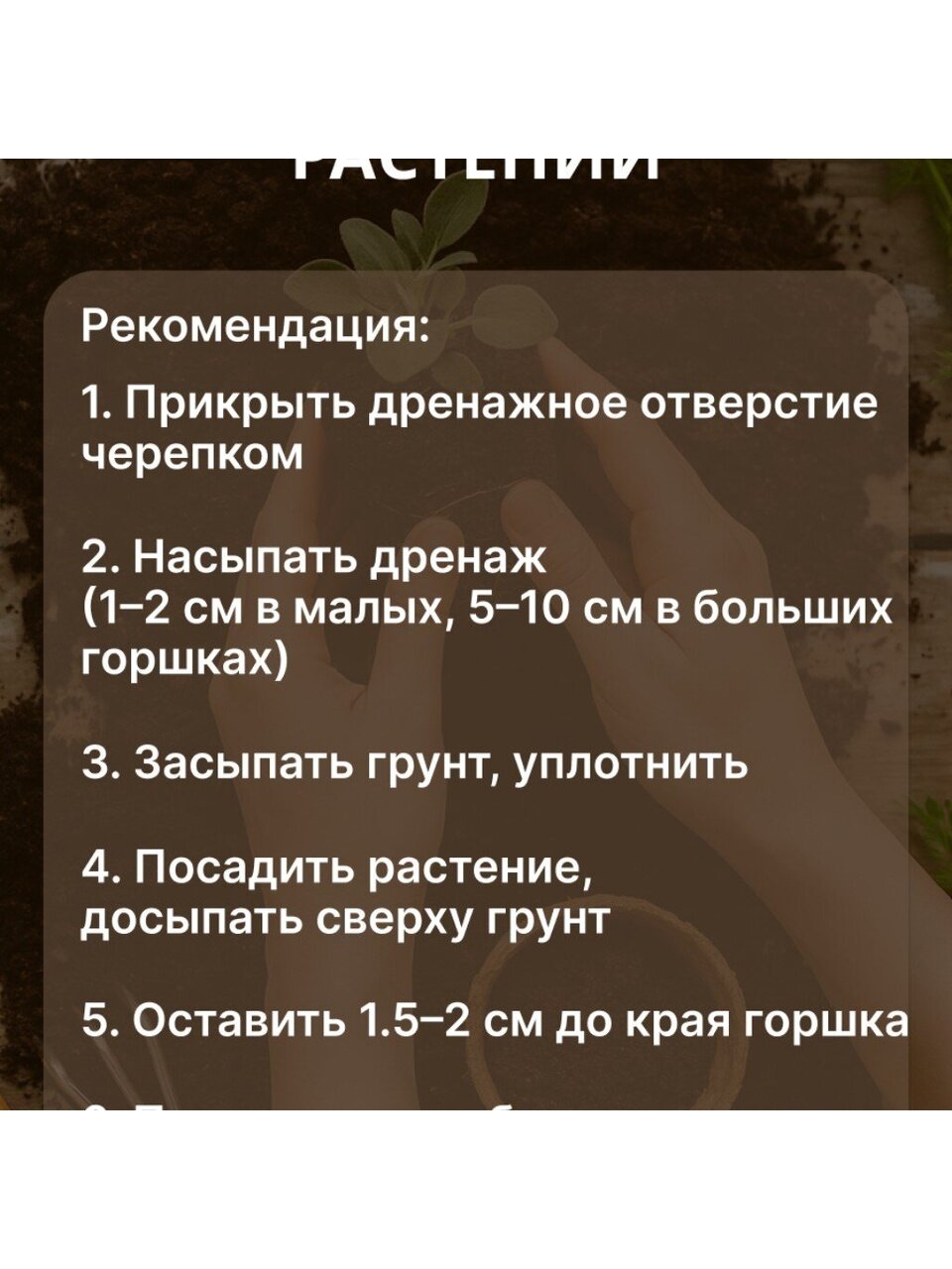 При посадке (пересадке) цветочно-декоративных горшечных растений рекомендовано прикрыть дренажное отверстие горшка глиняным черепком и насыпать дренажный слой из керамзита. В маленьких горшках толщина дренажного слоя должна быть 1-2 см., в больших 5-10 см. После этого насыпать грунт, слегка уплотнить, посадить растение, досыпать грунт, оставив свободным место для полива, не менее 1.5-2 см. от края горшка и полить при необходимости.