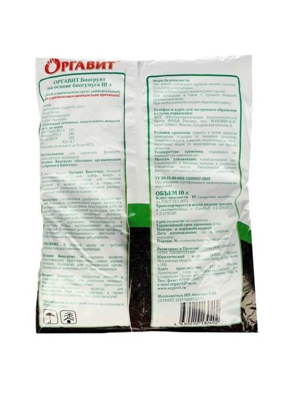 Оргавит Биогрунт не содержит веществ искусственного приосхождения, семян сорных растений, безопасно для окружающей среды, теплокровных животных, птиц, рыб, насекомых.