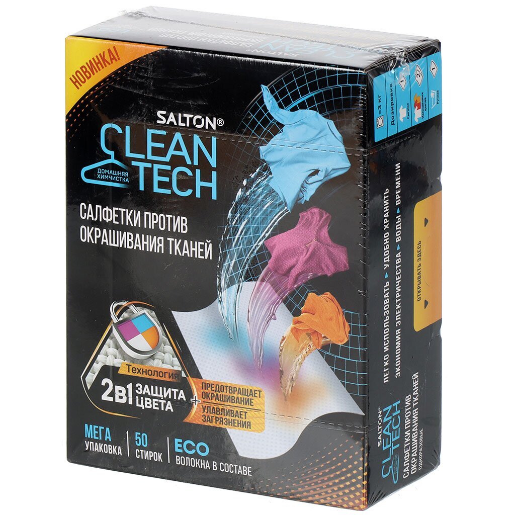 Бывает, что после стирки любимая вещь окрасилась в другой цвет и внешний вид испорчен навсегда? Теперь можно стирать белое и цветное белье с помощью салфеток против окрашивания тканей Salton CleanTecht.