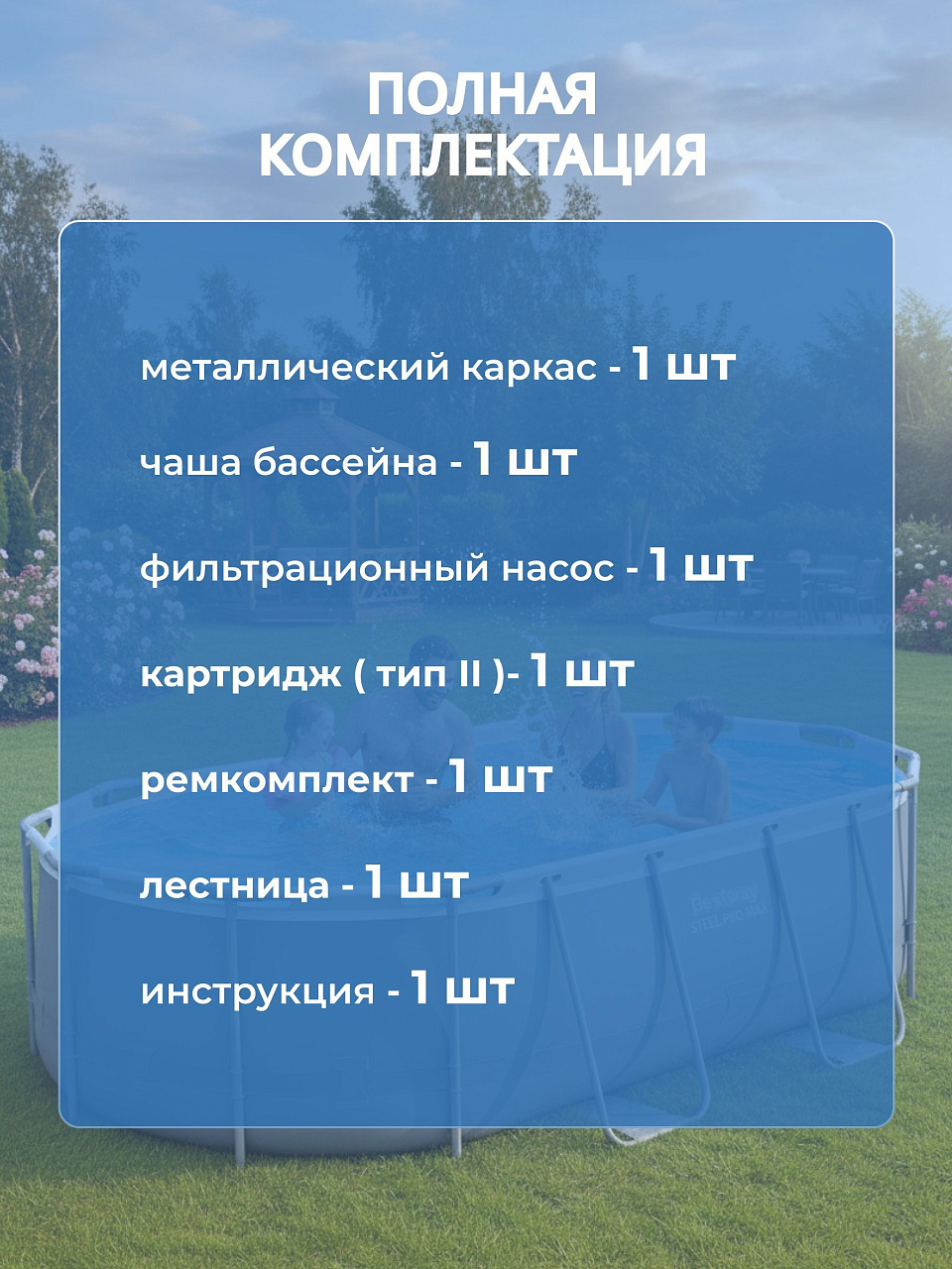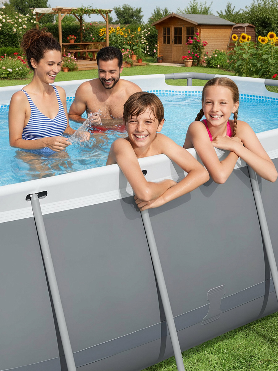 Если вы спрашиваете, подходит ли этот бассейн для детей, — да, бортик 100 см обеспечивает безопасность, а овальная форма удобна для игр и плавания. Как выбрать размер каркасного бассейна? Для семьи из 3-5 человек данный вариант — оптимальный компромисс между вместимостью и простотой монтажа.