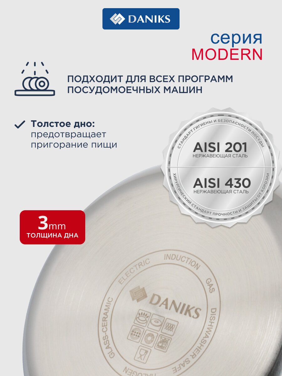 Кастрюля Daniks Модерн 4 л из нержавеющей стали с капсульным дном и стеклянной крышкой — универсальное решение для индукционных и любых других плит. Готовьте любимые блюда быстро и без хлопот.