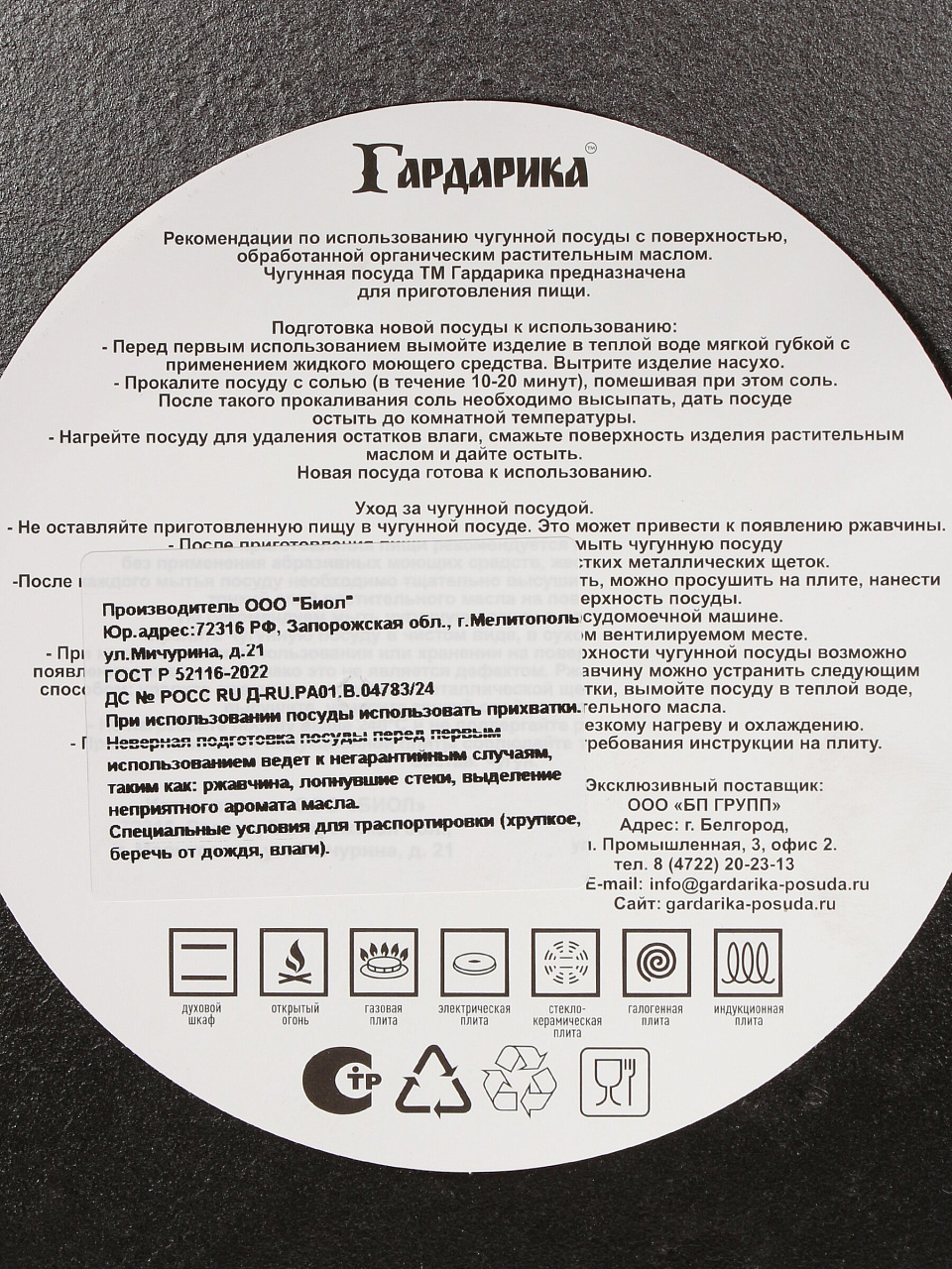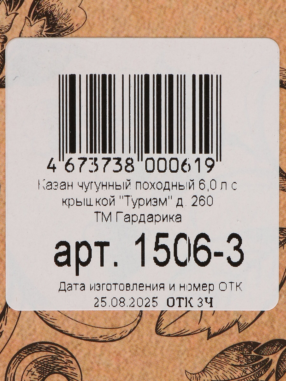 Казан чугун, 6 л, с крышкой, крышка чугун, с дужкой, Гардарика, 1506-3