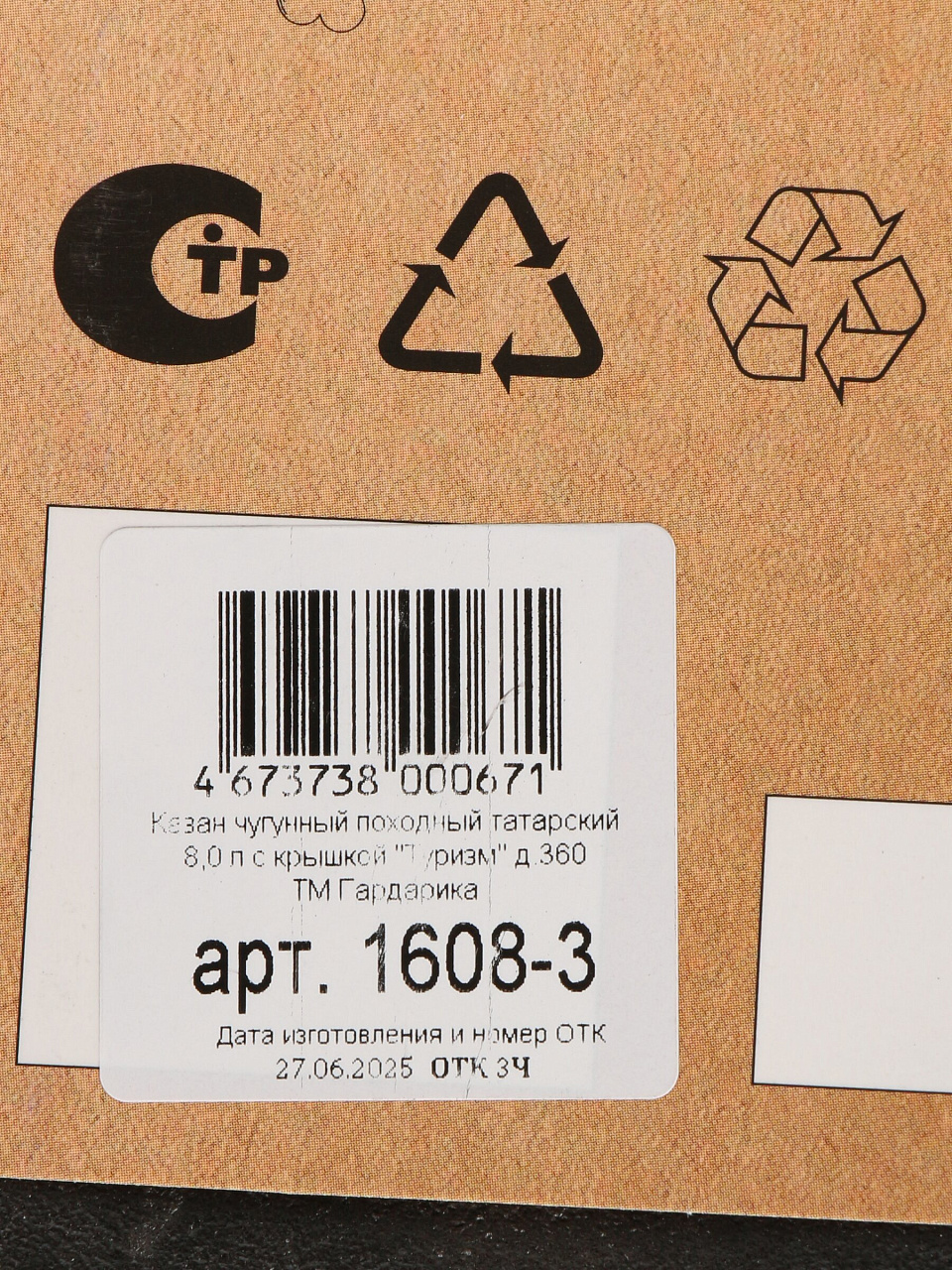 Казан чугун, 8 л, с крышкой, крышка чугун, с дужкой, Гардарика, 1608-3