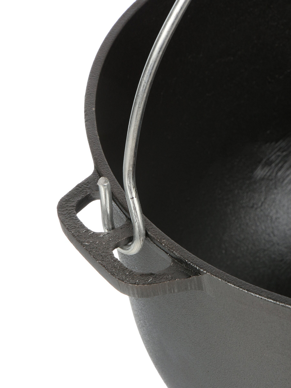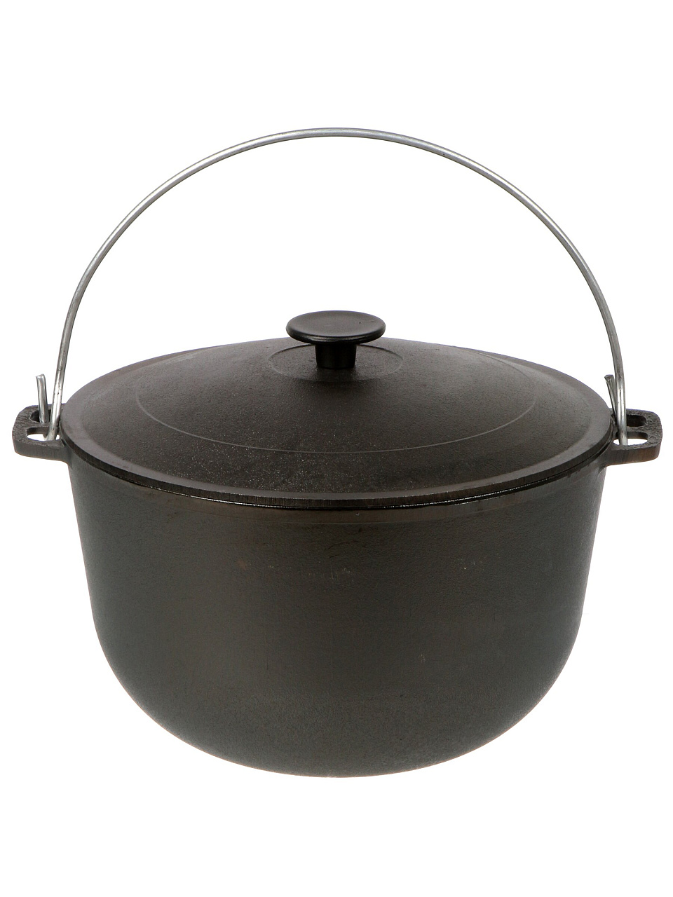 Казан рассчитан на объём 8 литров, выполнен из литого чугуна с крышкой и дужкой. Вес изделия — около 8–10 кг, что обеспечивает стабильность на плите и костре.