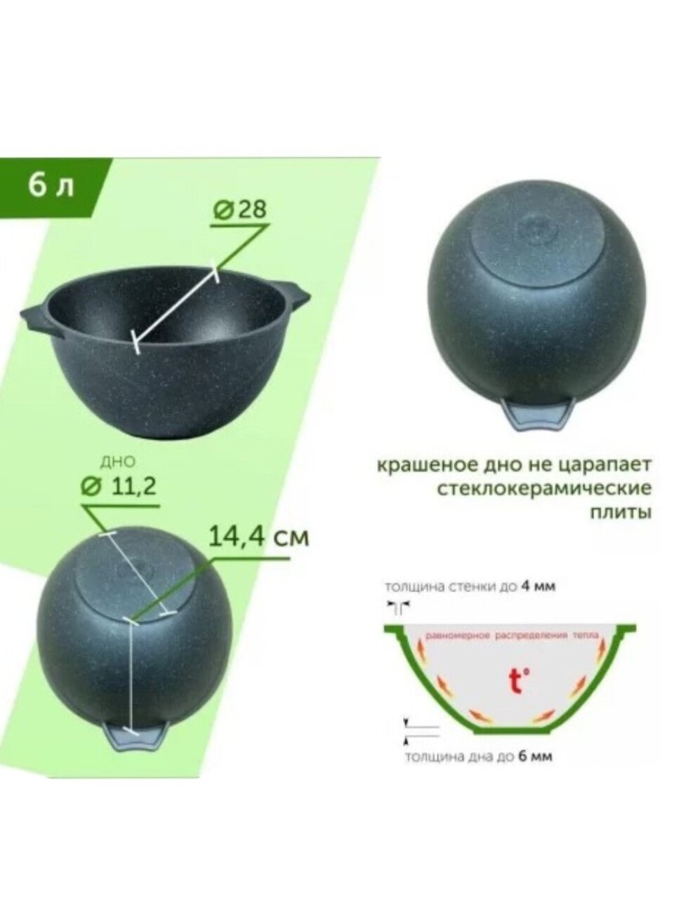 Казан серии Гранит из литого высококачественного пищевого алюминия станет незаменимым инструментом и надежным помощником на вашей кухне. Отличительной характеристикой является особая износостойкость и повышенные антипригарные свойства. Позволяет готовить с минимальным количеством масла, сохраняя вкусовые и полезные свойства продуктов. Литой толстостенный корпус не подвержен деформации, а утолщенное дно позволяет равномерно распределить тепло по всей поверхности. Подходит для газовых, электрических, стеклокерамических плит (согласно инструкции по эксплуатации) и чистки в посудомоечной машине (согласно инструкции по эксплуатации). Использование в духовом шкафу (согласно инструкции по эксплуатации).