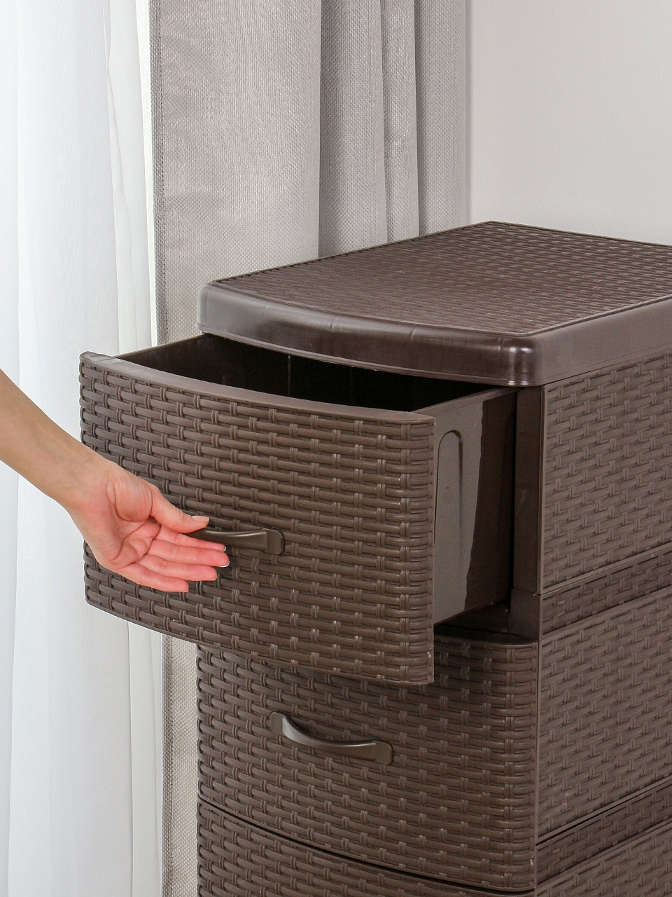 Комод 4 ящика Violet серии «Ротанг» — это практичное решение для хранения вещей в условиях ограниченного пространства. Благодаря размерам 38×48×96 см он легко помещается даже в небольших комнатах, а глубокие ящики обеспечивают быстрый доступ к содержимому. Пластиковый корпус и фасады устойчивы к влаге и не требуют особого ухода — достаточно протереть влажной салфеткой.