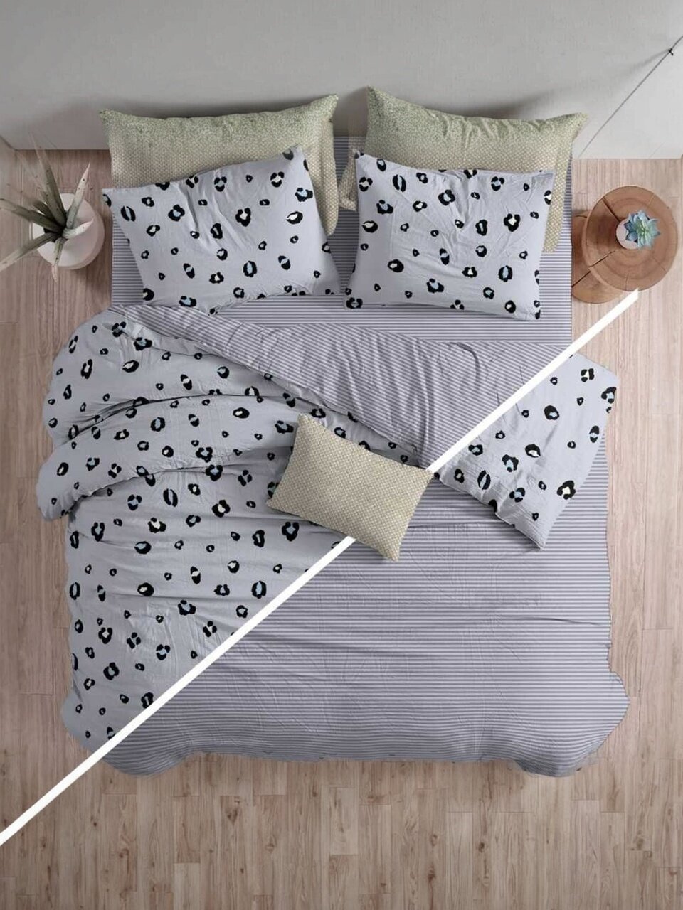 В комплекте: простыня 215х220 см, пододеяльник 175х215 см, две наволочки 70х70 см — подходит для стандартных двуспальных кроватей.