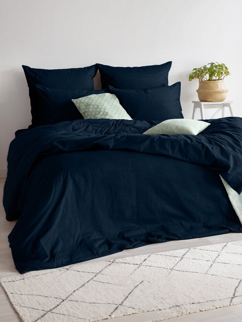 - Удобные размеры: простыня 220х240 см, пододеяльник 180х215 см, две наволочки 70х70 см — подходят для большинства стандартных двуспальных кроватей
