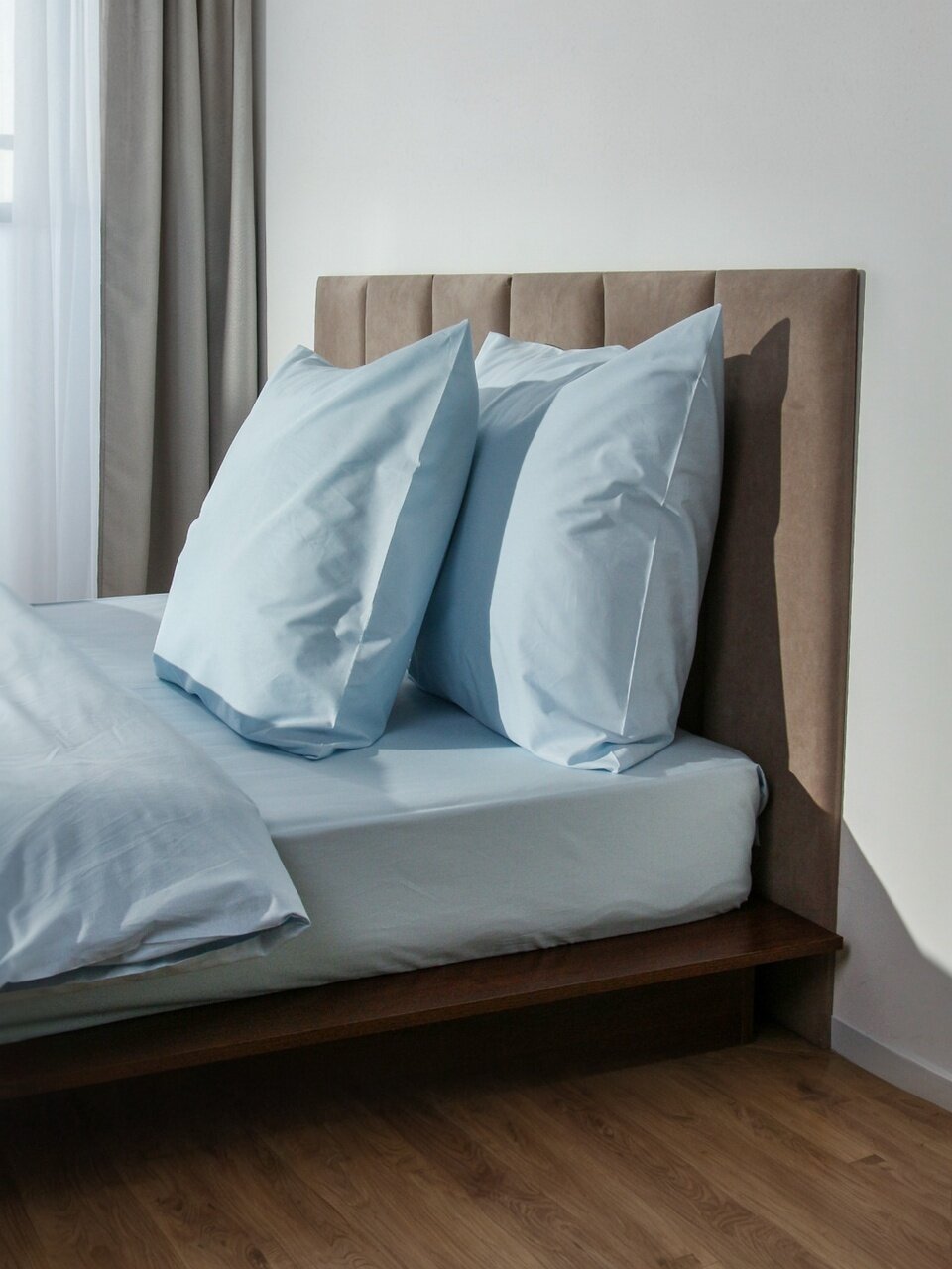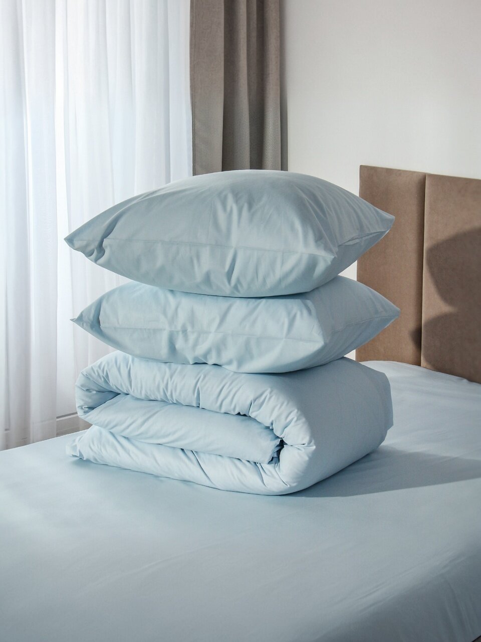 В этом комплекте простыня 215×240 см, пододеяльник 205×215 см, две наволочки 70×70 см — оптимально подходит для стандартных евро-кроватей без простыни на резинке.