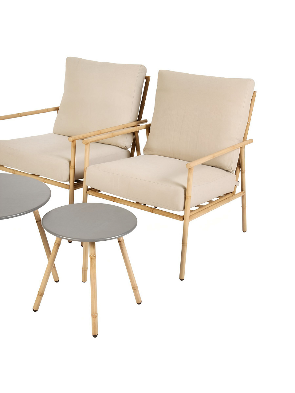 Садовая мебель Валлета — это современный комплект, который подойдёт для обустройства зоны отдыха на даче, в саду или на террасе частного дома. В наборе: два удобных кресла, диван и два компактных стола с круглыми столешницами, а также мягкие подушки для максимального комфорта. Лёгкий бежевый цвет гармонирует с любым интерьером и ландшафтным дизайном. Грузоподъемность кресла - 100 кг.