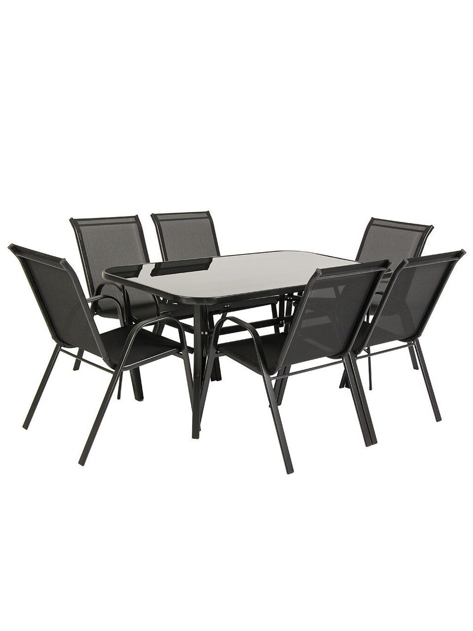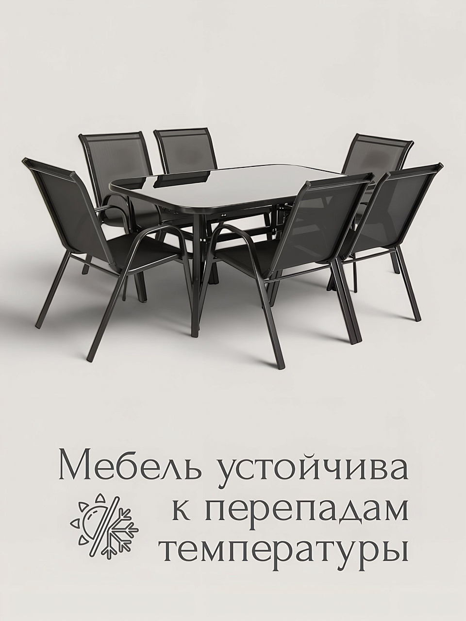 Стол с прямоугольной столешницей из прочного стекла размером 150х90 см обеспечивает достаточно места для сервировки, а шесть удобных стульев с жестким сиденьем гарантируют комфорт даже при длительном использовании. Мебель устойчива к различным погодным условиям, что позволяет использовать ее круглый год и не беспокоиться о сохранности внешнего вида.