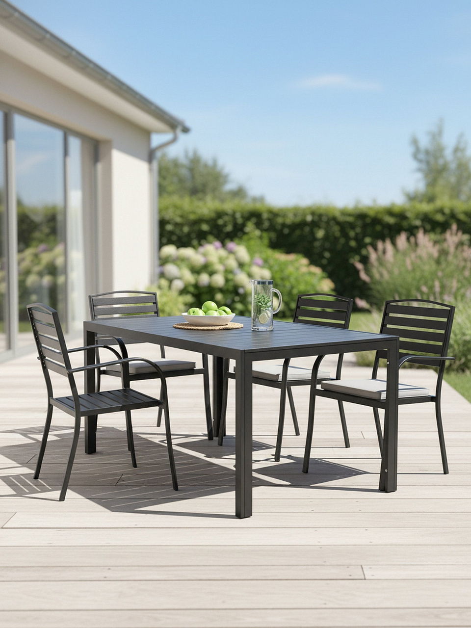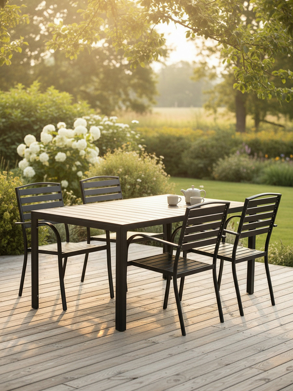 Этот обеденный гарнитур — оптимальный выбор для тех, кто ищет баланс между эстетикой и практичностью. Металлический каркас обеспечивает высокую стабильность конструкции, что критически важно при использовании на открытом воздухе. В отличие от деревянных моделей, этот комплект не требует сложного сезонного ухода, достаточно периодической очистки влажной тканью, чтобы сохранить первоначальный вид покрытия.