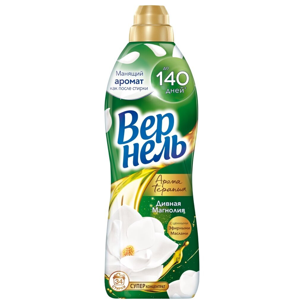 Концентрированный кондиционер для белья Вернель Ароматерапия Дивная магнолия 870 мл (34 стирки) подарит Вашему белью не только невероятную мягкость, но и волшебный аромат лотоса, а благодаря специальным аромакапсулам в составе кондиционер для стирки Вернель позволит наслаждаться интенсивным ароматом белья до 140 дней.
