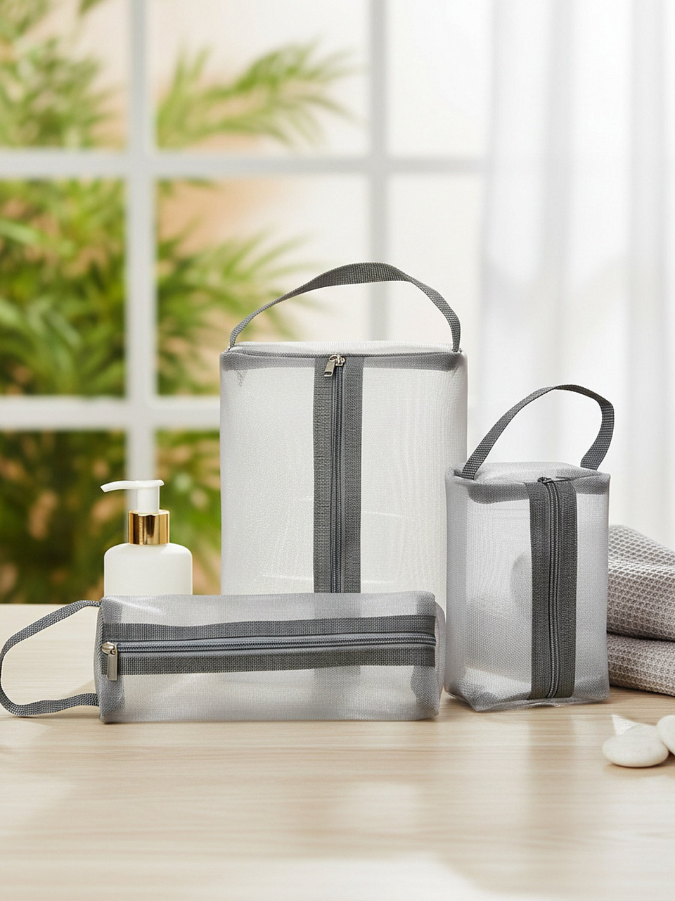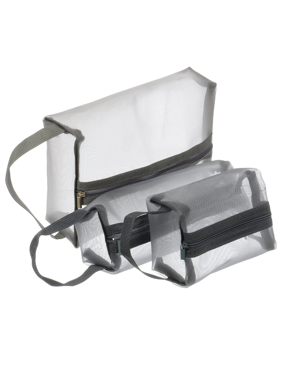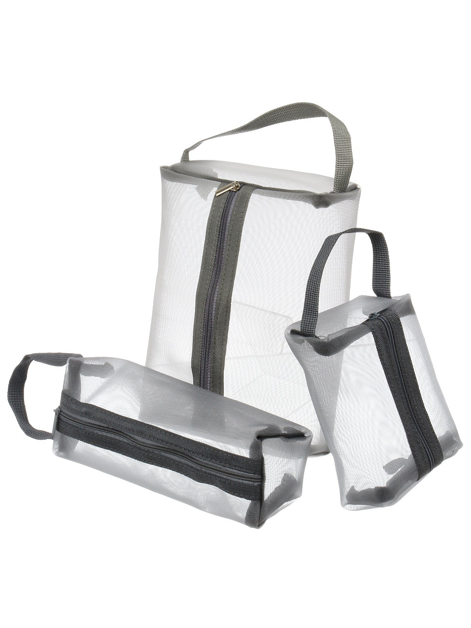 Набор косметичек 3 шт, сетка, серый: идеальный порядок в поездках и дома — три универсальных размера для хранения косметики, аксессуаров и мелочей.