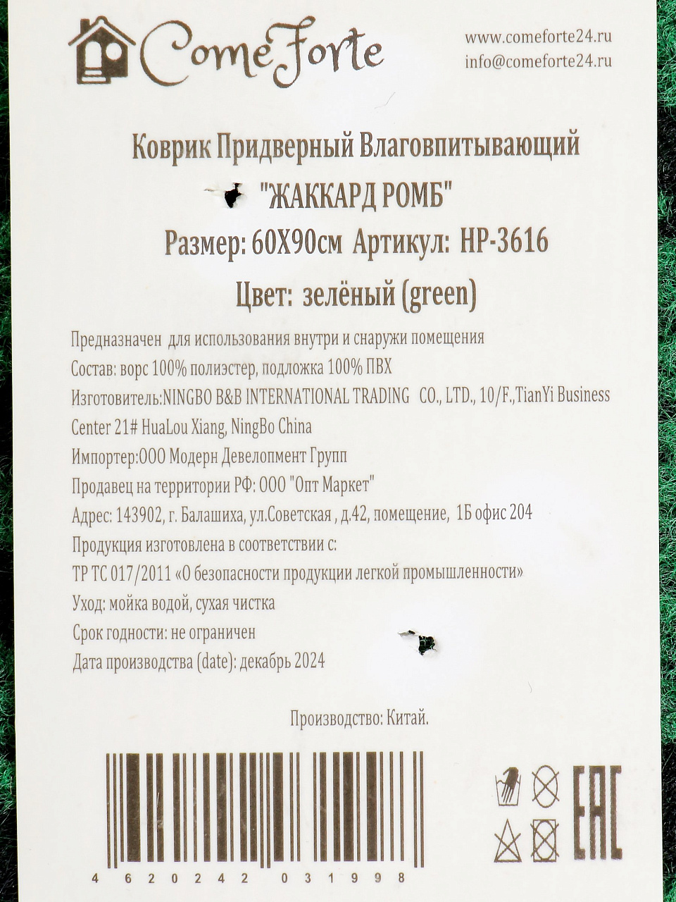 Часто спрашивают: какой коврик выбрать для улицы или прихожей? Модель ComeForte HP-3616 отличается повышенной влаговпитываемостью и не скользит по полу. В отличие от аналогов из резины, полиэстер приятнее на ощупь, не имеет запаха и быстрее сохнет. Подходит ли коврик для дачи? Да, он устойчив к частым чисткам и не теряет форму даже при интенсивной эксплуатации. Размер 60х90 см удобен для стандартных и широких дверных проёмов, зелёный цвет и геометрический рисунок «ромбы» гармонируют с любым интерьером.
