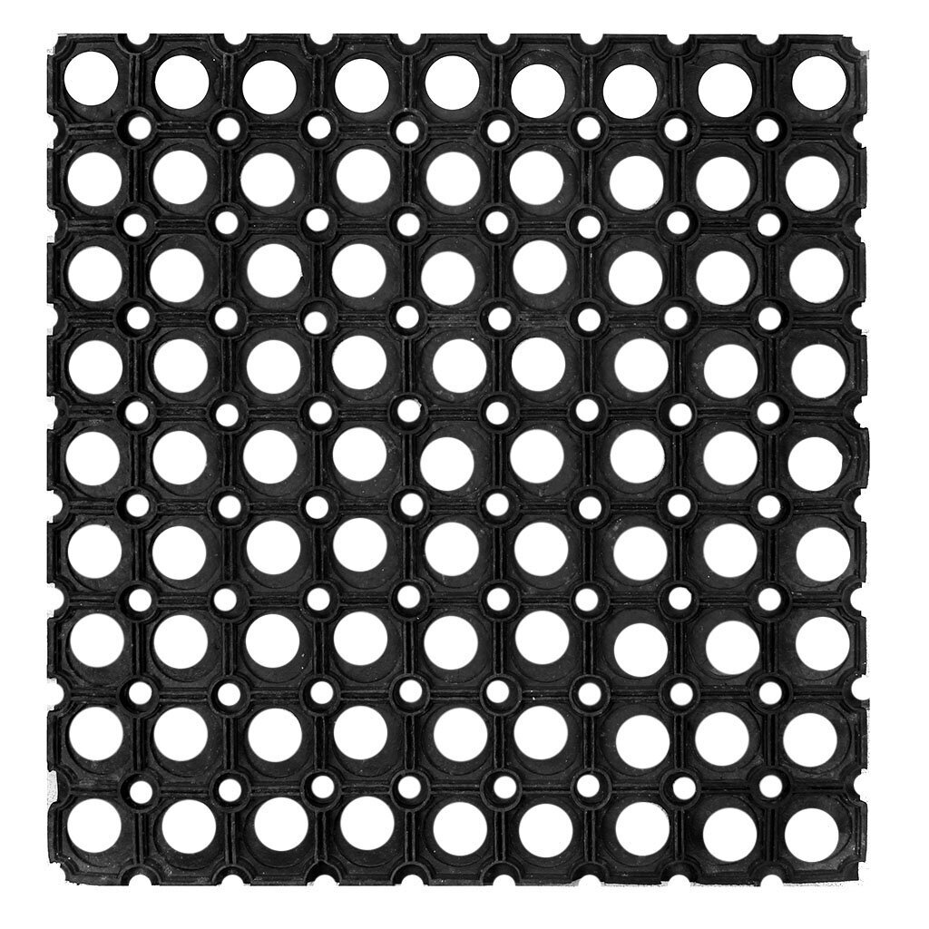 Придверный коврик изготовлен из прочной и долговечной резины. Конструкция коврика имеет специальные ребра, которые помогают более эффективно удалять грязь с обуви, а отверстия в конструкции удаляют излишки воды.