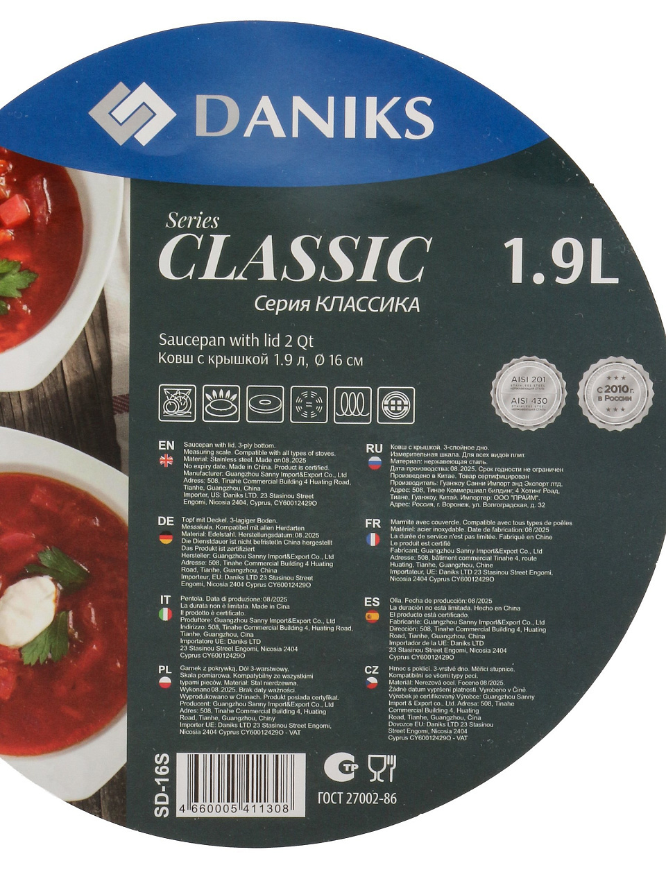 Вы можете приобрести «Ковш нержавеющая сталь, 1.9 л, крышка стекло, металлическая ручка, индукция, Daniks, Классика, SD-16S» и другие товары в нашем интернет-магазине в Ельце по низким ценам и с бесплатным самовывозом.