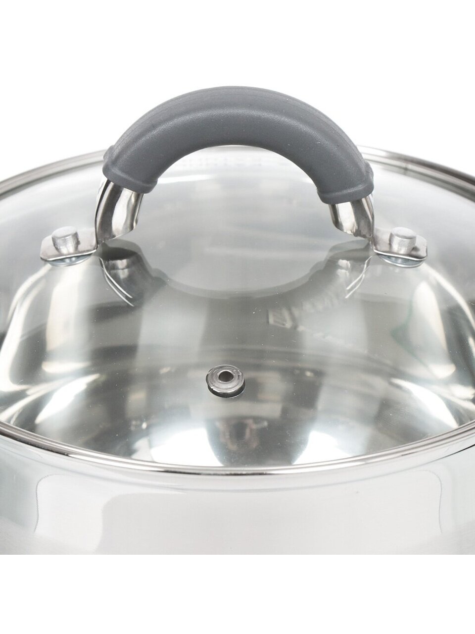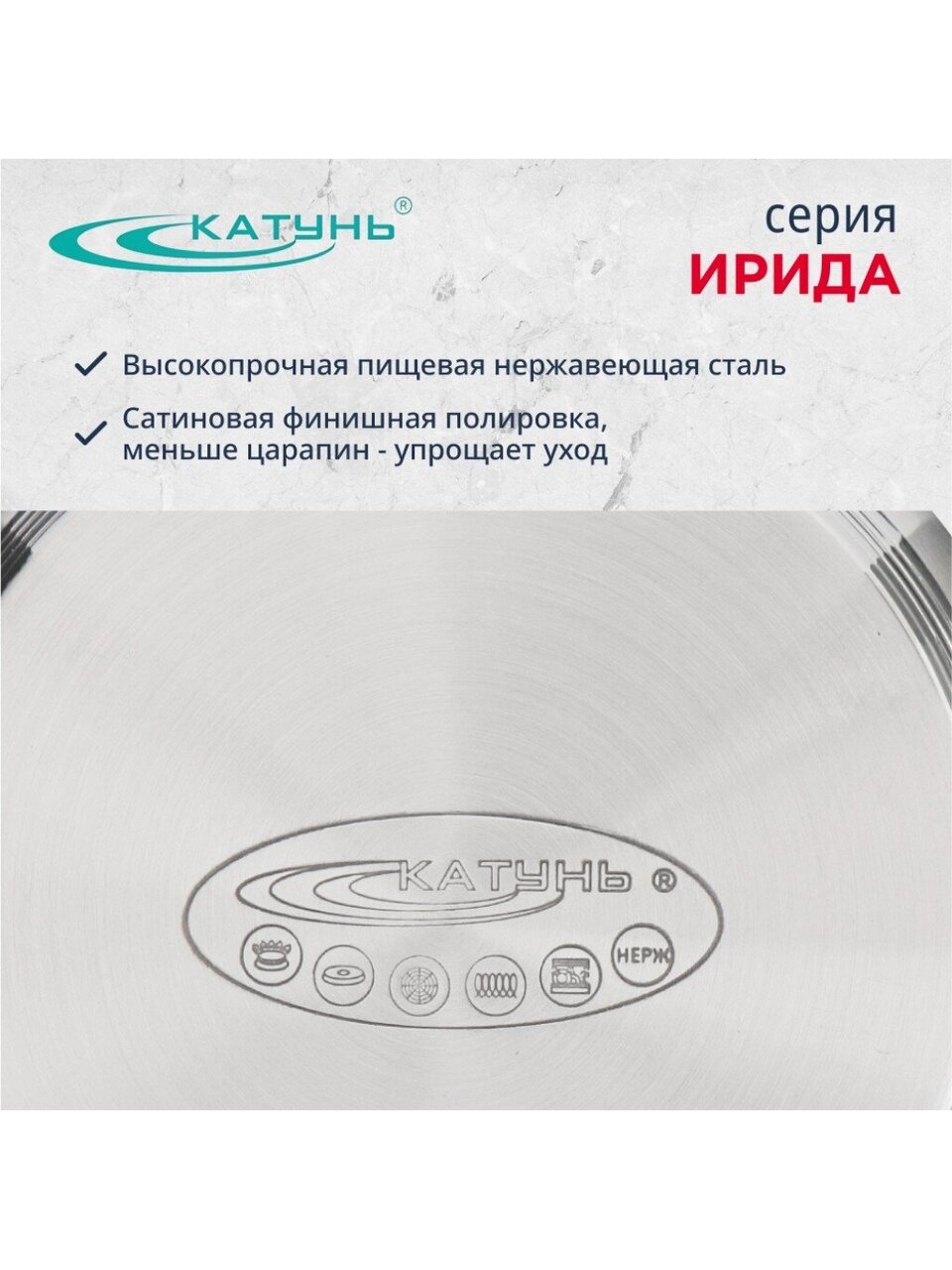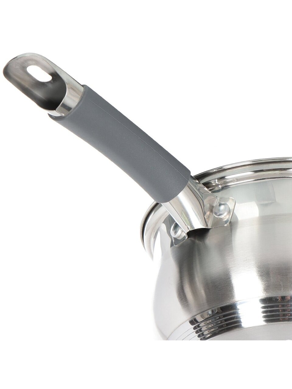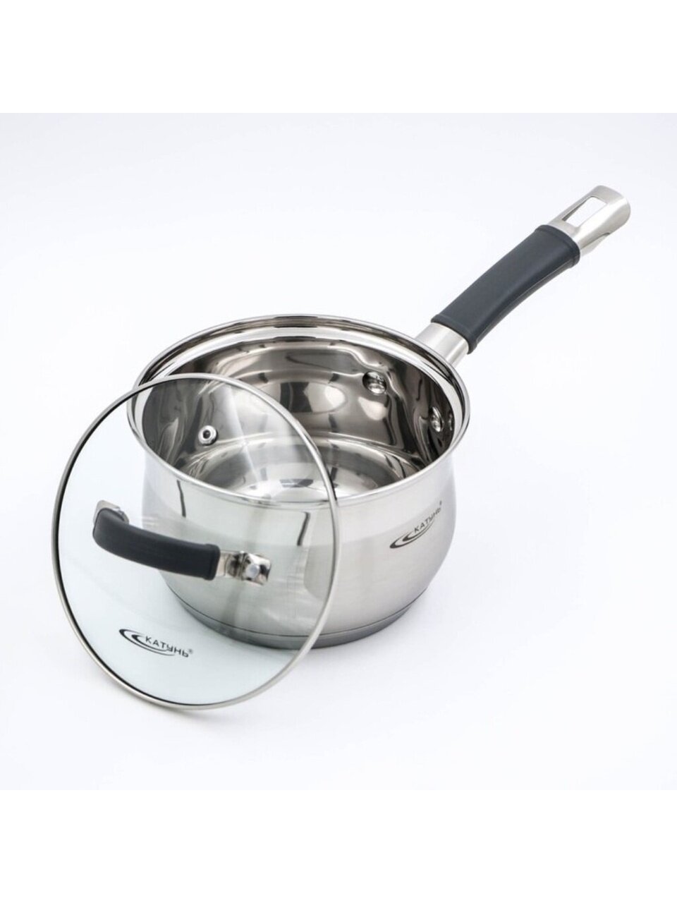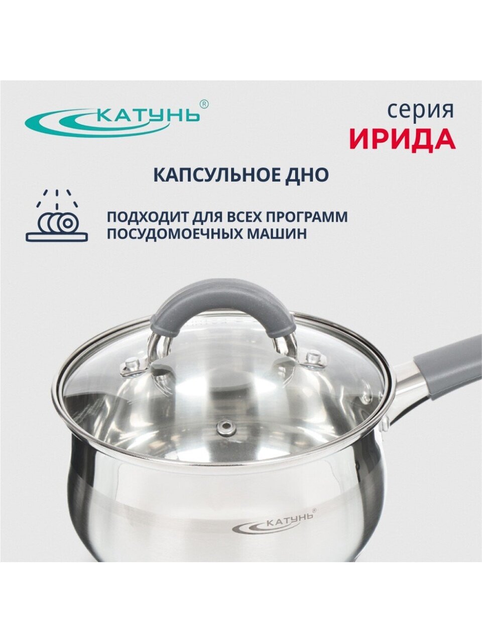 Ковшик из нержавеющей стали Катунь Ирида объемом 1,9 литров идеально подойдет для приготовления небольшого количества еды. Крышка стеклянная, с пароотводом, прозрачная. Ручки ковша покрыты термостойким силиконом.