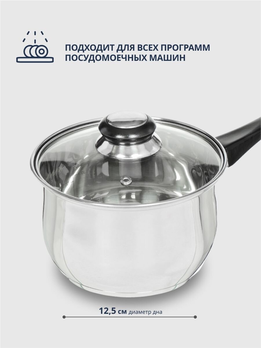 Ковшик посуды DNN SD-A19-16S выполнен из высококачественной нержавеющей стали марки 201. Крышка из прозрачного стекла позволяют контролировать процесс приготовления пищи. Ручка удобна, прочна и не нагревается при использовании посуды.
