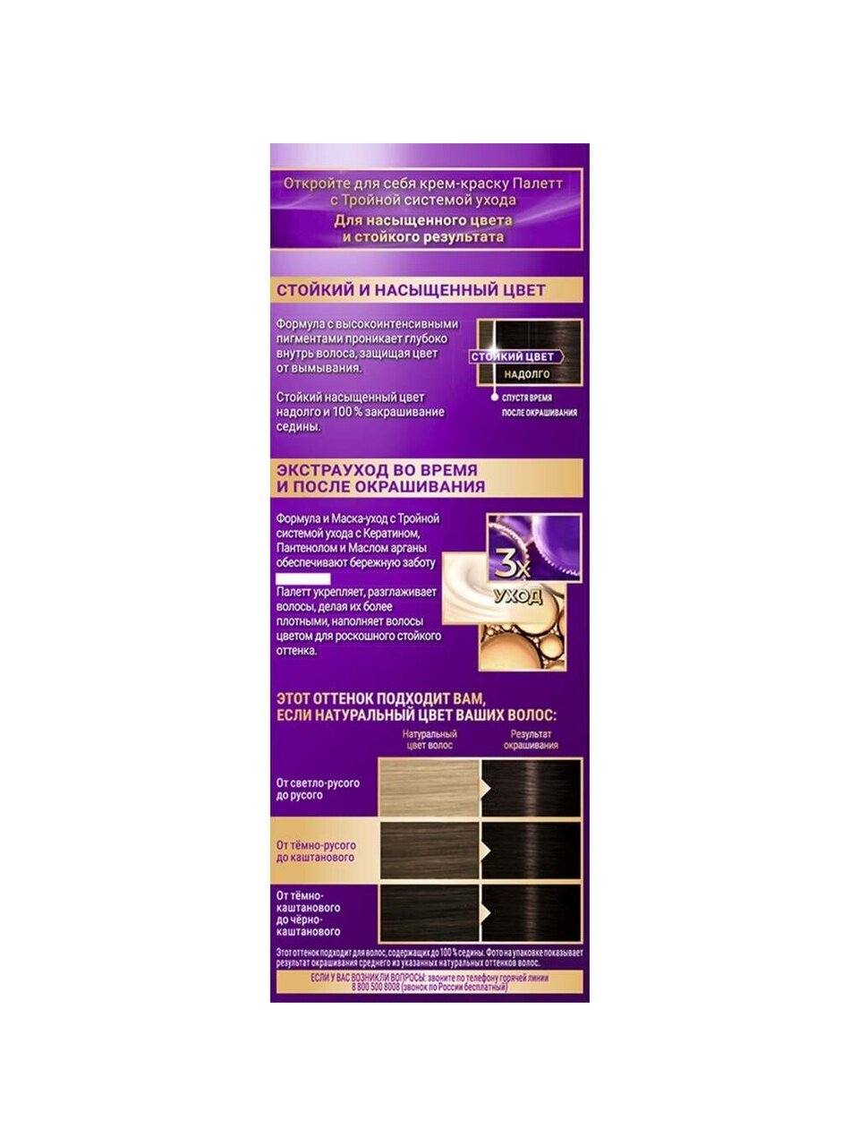 Откройте для себя стойкую крем-краску Палетт с кератин-комплексом для длительной интенсивности и богатства цвета. Формула с высокоинтенсивными пигментами глубоко проникает в структуру волоса, защищая цвет от вымывания. Тройная система ухода с кератином, пантенолом и Nutri-маслом обеспечивает бережную заботу о волосах. Насыщенный стойкий цвет сохраняется надолго, превосходно закрашивает седину и осветляет до 5 тонов.