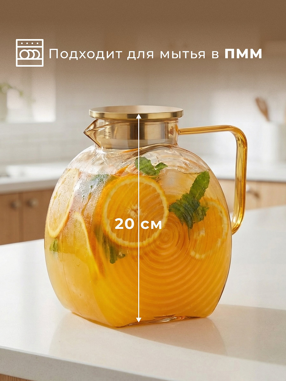 Боросиликатное стекло отличается высокой прочностью, устойчиво к перепадам температур, что позволяет безопасно использовать кувшин для горячих и холодных напитков. Крышка надежно защищает содержимое от попадания пыли и насекомых, а также предотвращает проливание. Кувшин подходит для мытья в посудомоечной машине, что значительно облегчает уход и экономит время. Высота 20 см делает его удобным для хранения в холодильнике и сервировки на столе.