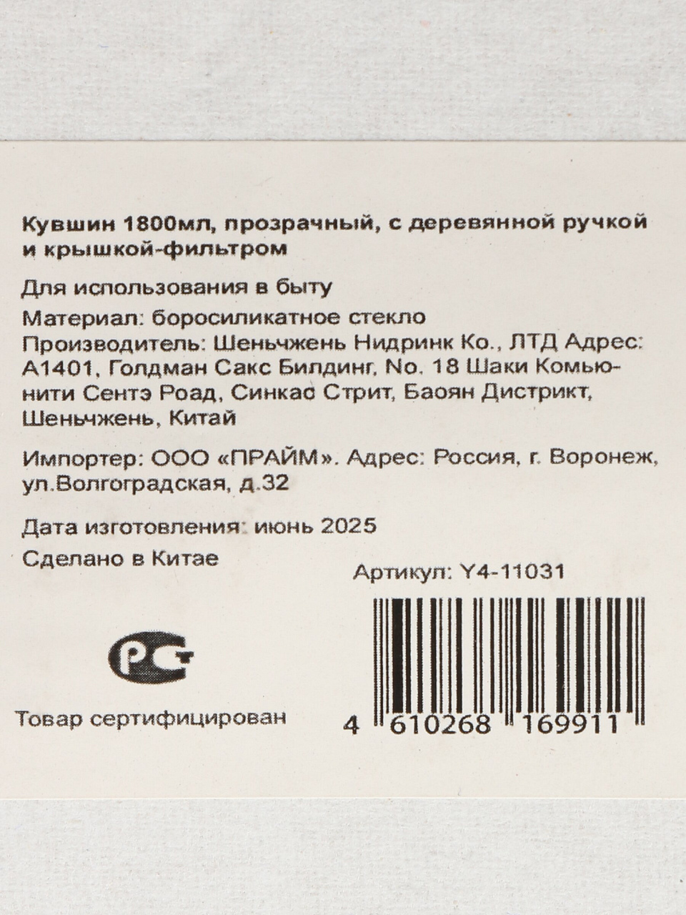 Кувшин боросиликатное стекло, 1.8 л, прозрач, дерев ручка, крышка-фильтр, Y4-11031