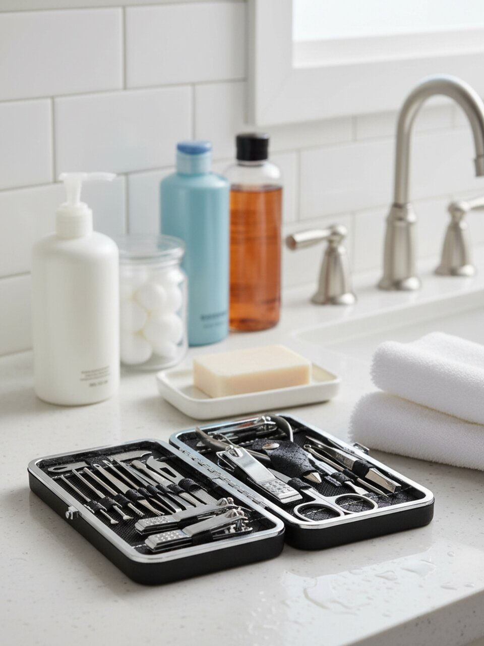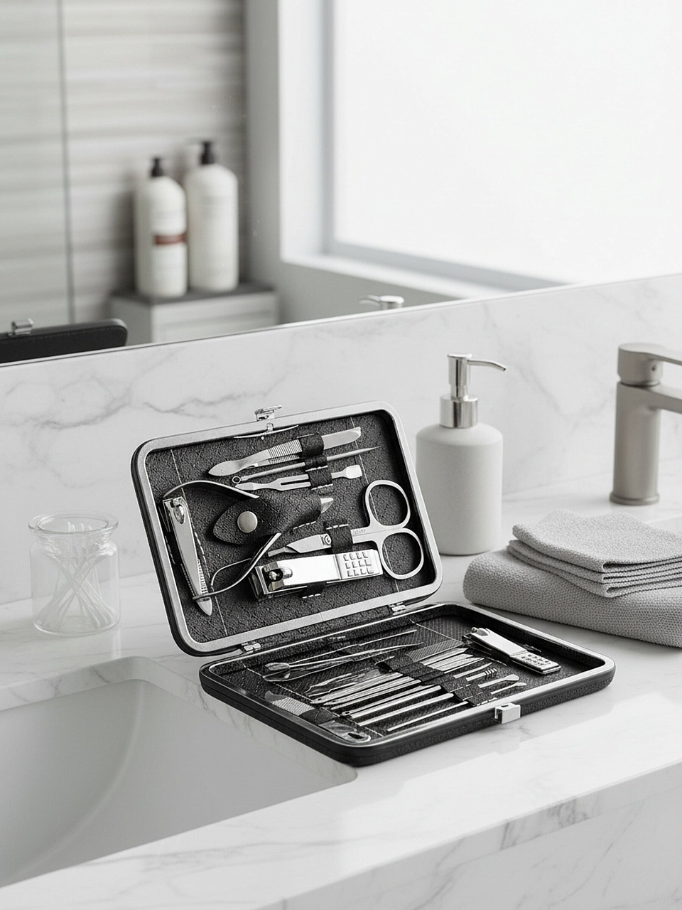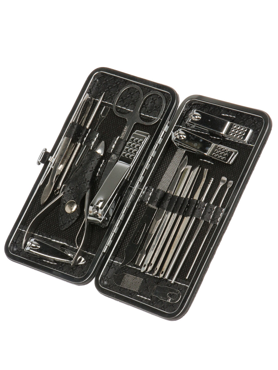 В отличие от базовых комплектов, здесь 19 инструментов из нержавеющей стали, надёжный футляр и расширенная комплектация для маникюра и педикюра.