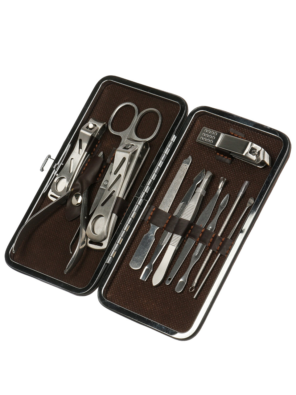В комплекте: кусачки для ногтей, ножницы, пилки, пинцет, инструменты для кутикулы и чистки, все из нержавеющей стали, в компактном футляре.