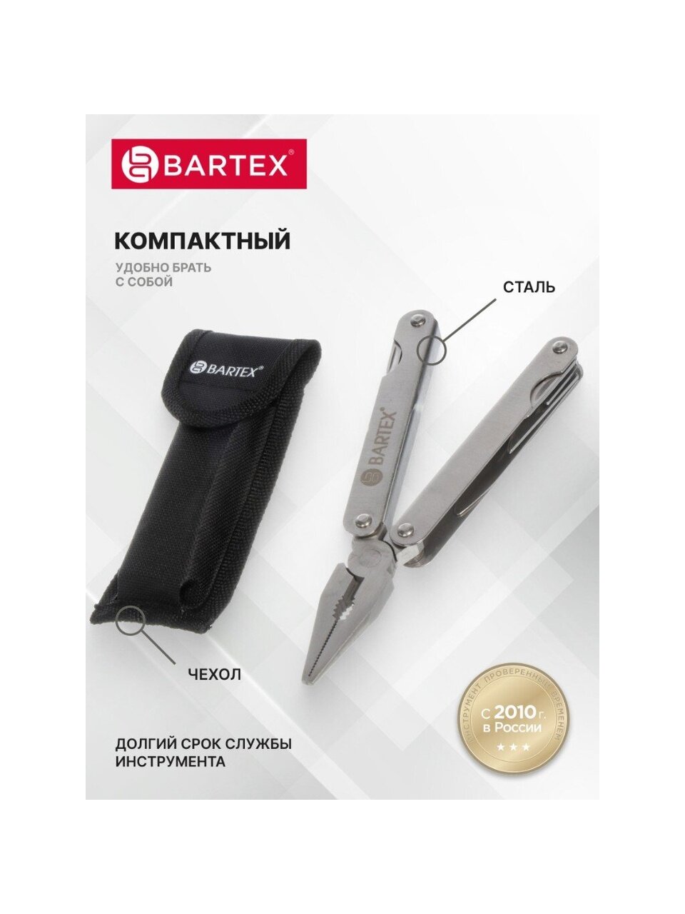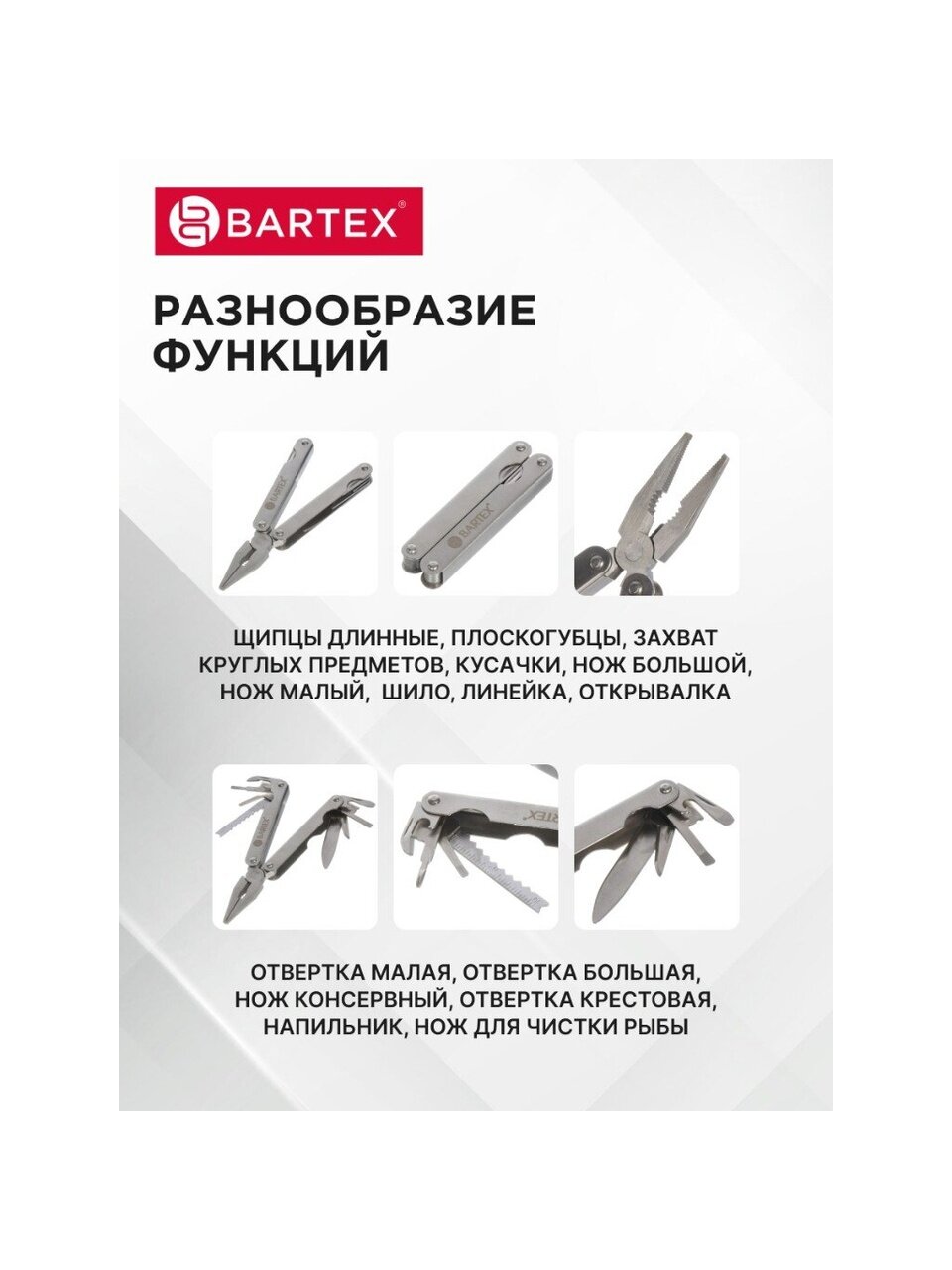 Мультитул Bartex выручит Вас в походе, на даче, в поездке, на охоте или рыбалке. Это невероятно удобно, когда Вы находитесь вдали от своей домашней мастерской, но все равно имеете доступ к самым необходимым инструментам. Если Вам требуется несложный ремонт здесь и сейчас, мультитул Bartex – лучшее решение.