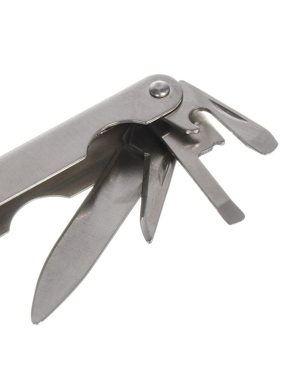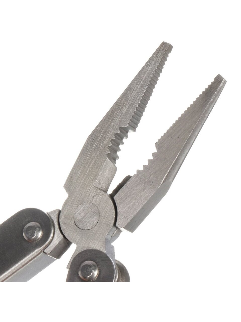 - Опции: щипцы длинные, плоскогубцы, захват круглых предметов, кусачки, нож большой, нож малый, отвертка малая, отвертка большая, нож консервный, открывалка для бутылок, отвертка крестовая, шило, линейка, напильник, нож для чистки рыбы.