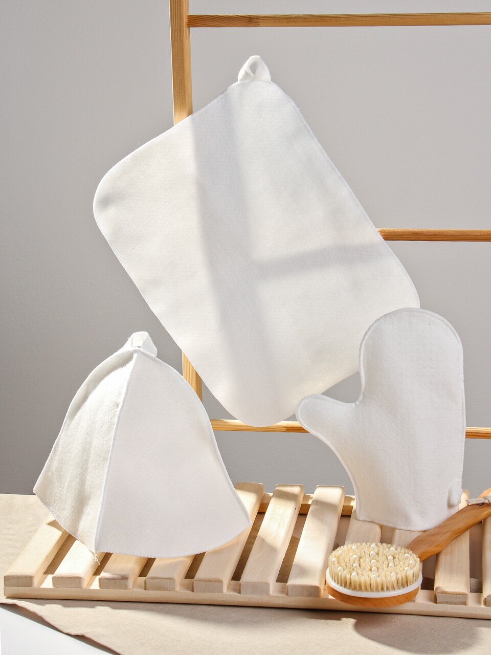 - Классический комплект для бани и сауны: оптимальное сочетание шапки, коврика и рукавички для защиты и уюта.