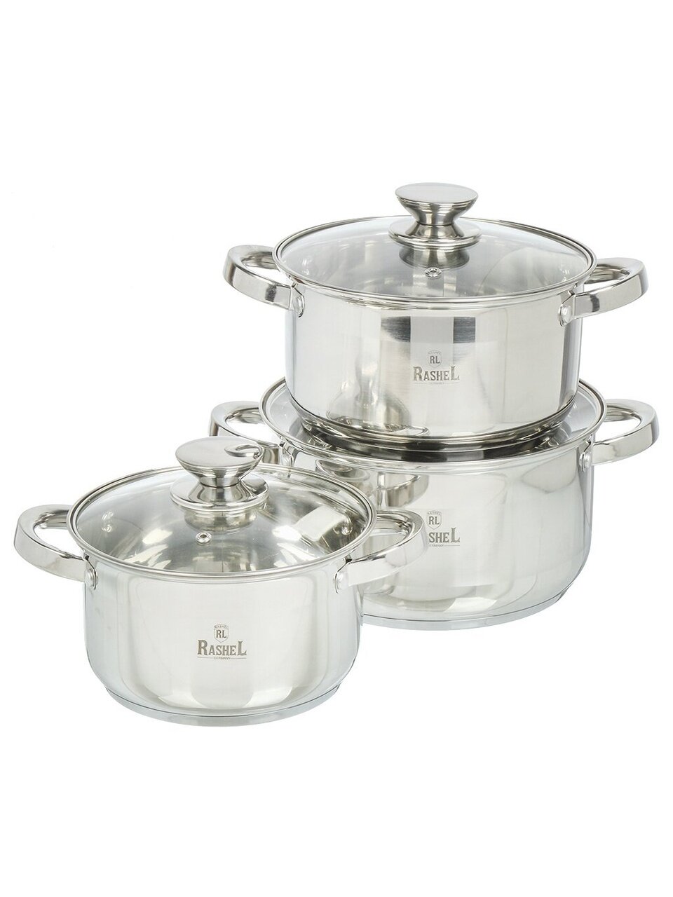 Набор кастрюль из нержавеющей стали RasheL: 6 предметов для индукции, объёмы 2.6/3.6/4.7 л — долговечность, универсальность, хранение в холодильнике.