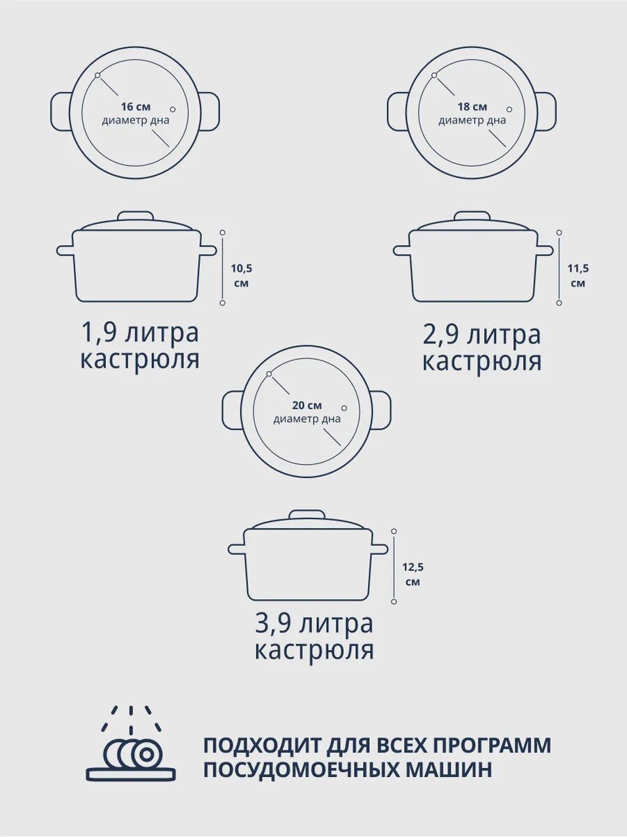 - Универсальный набор: три кастрюли разного объема (1.9, 2.9, 3.9 л) с крышками — для готовки любых блюд