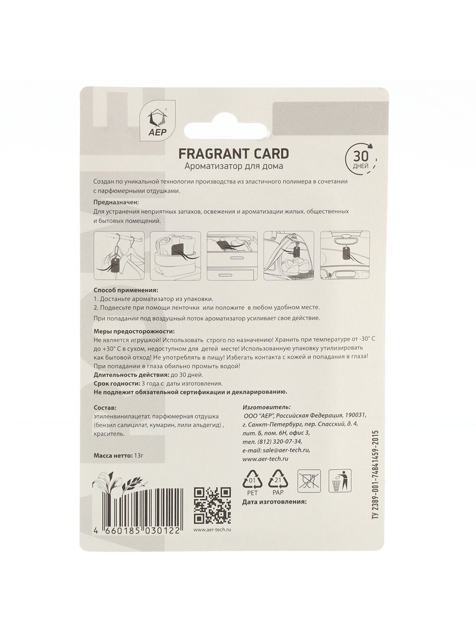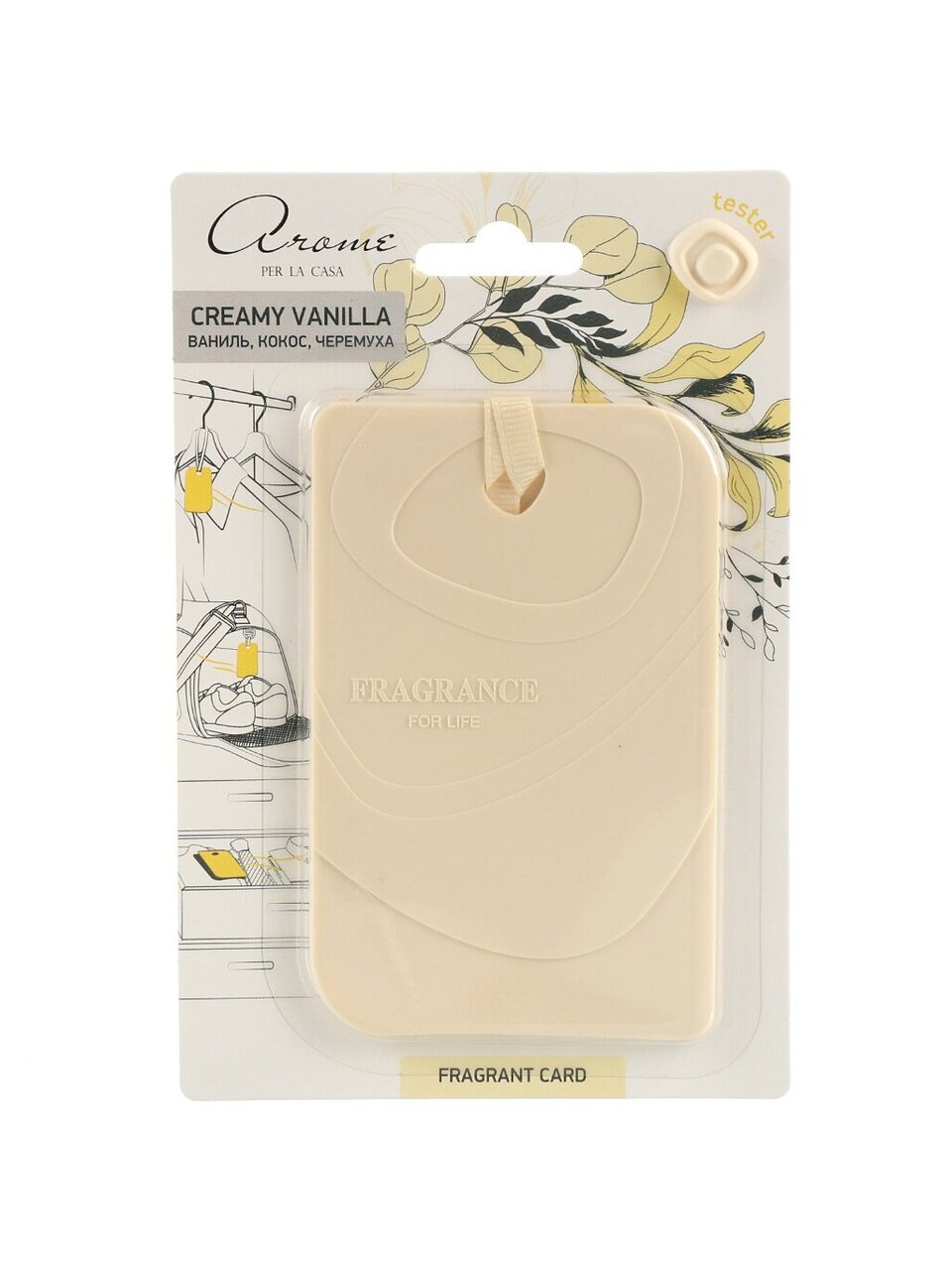 Ароматизатор Fragrant Card отлично подходит для ароматизации малых пространств: комод с бельем, шкаф с вещами, сумка, автомобиль и т.д. Наполнит дом приятными и изысканными ароматами. Если вам не хватает положительных эмоций и хорошего настроения, аромат Creamy vanilla - точно то, что вам нужно!