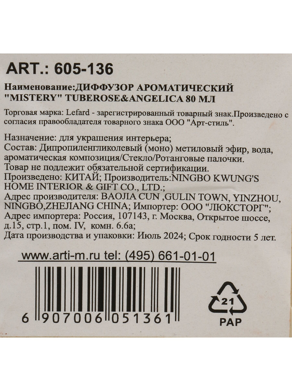 Аромадиффузор Lefard, 80 мл, Mistery Tuberose & Angelica, 605-136