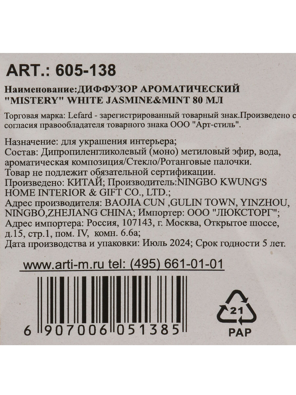 Аромадиффузор Lefard, 80 мл, Mystery White Jasmine & Mint, 605-138
